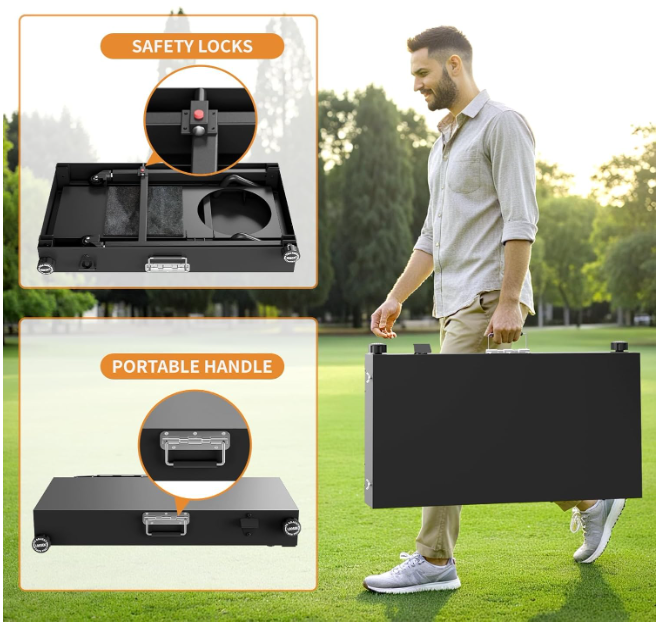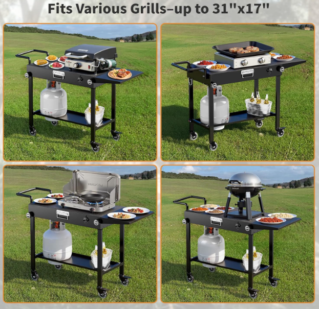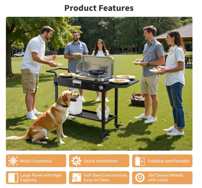 ZellePortable Grill Table - Featuring a pre-assembled foldable frame, this BBQ table expands in 20 seconds with 360° lockable wheels. The compact design fits in car trunks effortlessly, making it ideal for outdoor grilling and camping trips.