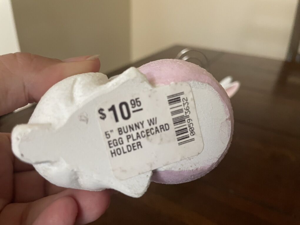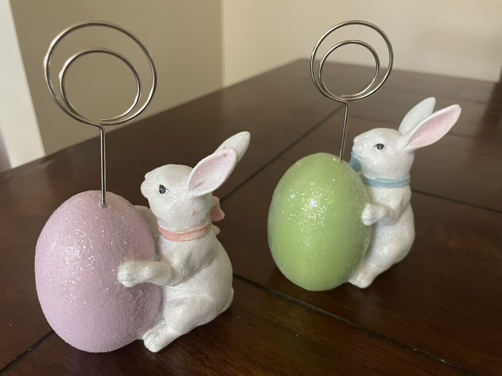 I have 2 new Easter bunny rabbits with eggs. They have a silver piece that holds a picture or a place card. They are a little sparkly. They are about 5 inches tall. The price tags show shows they were originally $10.95 each. I’m asking $8 for both of them together. See my other ads for jewelry, artwork, home decor and more.