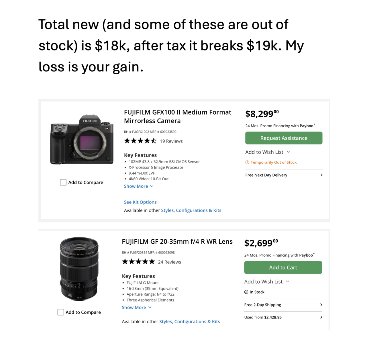 ApplePayJust bought earlier this year but I'm loving the portaiblity of my new XE5 and those lenses. Testing out the waters to sell the GFX system. Could probably sell the whole kit for a great price, if you're intersted let me know. (after messaging a few of you interested, around 16k seems fair) GFX 100 ii with EVF and EVF Tilt Adapter 8,683 actuations as of listing update today 27Aug 20-35mm 32-64mm 45-100mm 100-200mm