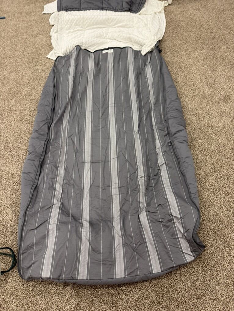 Has a sham and a case item number Aug33. Has a small lotion type spot on the sheet.