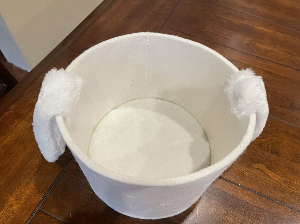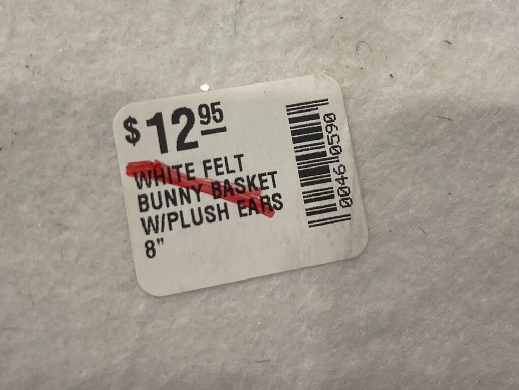 I have a white felt basket with a bunny rabbit face on it. It has fuzzy ears. It is 6 inches tall and 8 1/2 inches across. It is new but has some green fuzzy things in it at the store so it has some fuzz on the inside. The price tag on the bottom shows it was originally $12.95. It was sold with Easter stuff but would be cute in a nursery or child’s room too. See my other ads for jewelry, artwork, home decor and more.