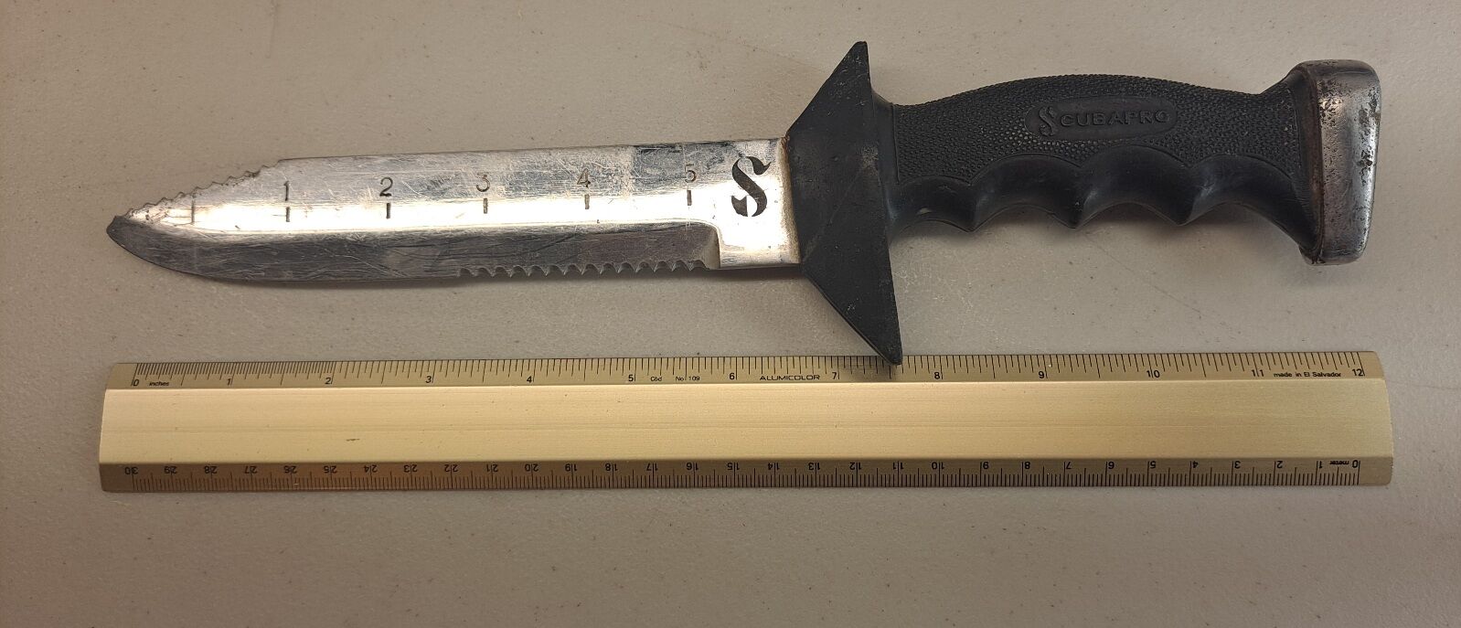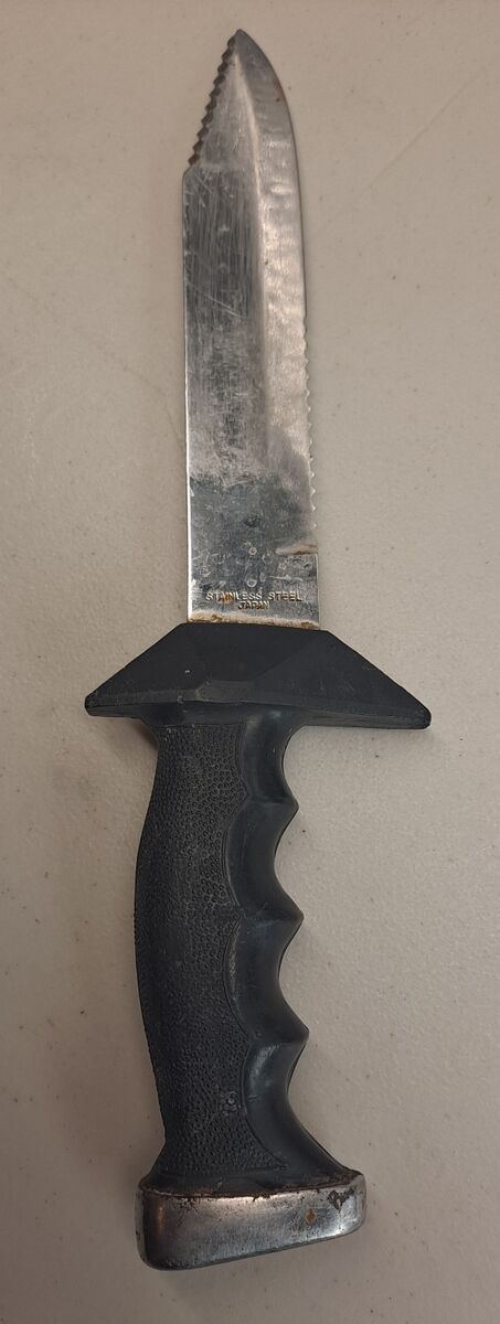 This vintage Scubapro dive knife combines durability and precision, It is an essential gear item for any scuba enthusiast. The strong 6-inch stainless steel blade was forged in Japan and showcases the impeccable craftsmanship expected from a brand synonymous with quality. The knife easily maneuvers through dive tasks, thanks to its robust design and comfortable grip. Included with the knife is a sturdy sheath with a retaining cap, ensuring safe storage and easy access when needed. Whether for routine maintenance or unexpected situations, this knife tool is a reliable companion for underwater adventures. Its legacy and performance make it a timeless addition to any scuba diver's collection. Also included are 2 new Akona rubber straps, 23 inches long with quick release clips.