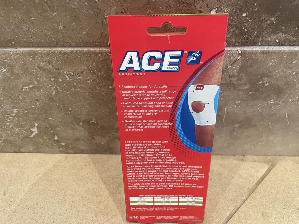 I have a new Ace knee brace with side stabilizers. It is white and size Medium. It is still in the box. See my other ads for jewelry, artwork, home decor and more.