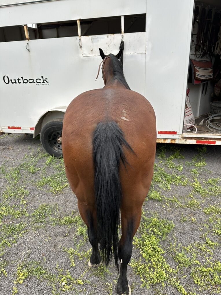 Meet Abby. She’s a 18 year old AQHA bay mare. Stands just over 14 hands. About as good of a horse as you’ll get. Easy to catch, load, shoe and ride. Will go anywhere you point her. She’s packed meat and been all over the mountains. Super calm demeanor and great for kids or beginner riders. She was recently diagnosed with laminitis in her front hoofs. She’s still rideable just can get a little soar. Would recommend putting boots on her fronts where shoeing aggravates that toe bone. $1500