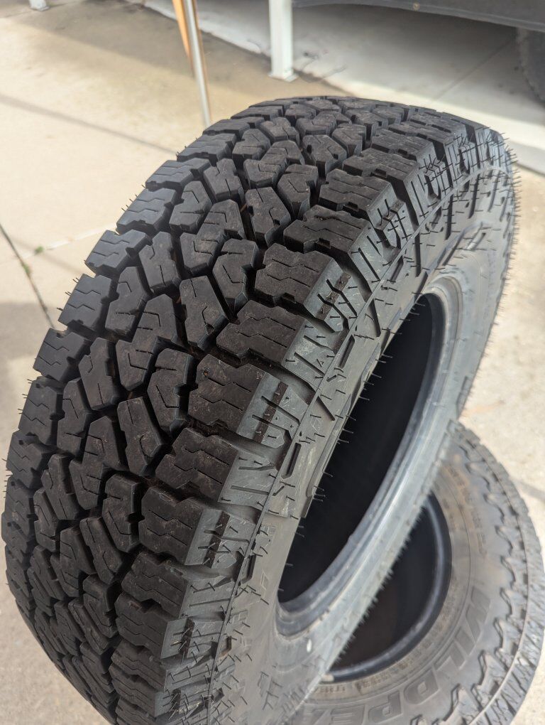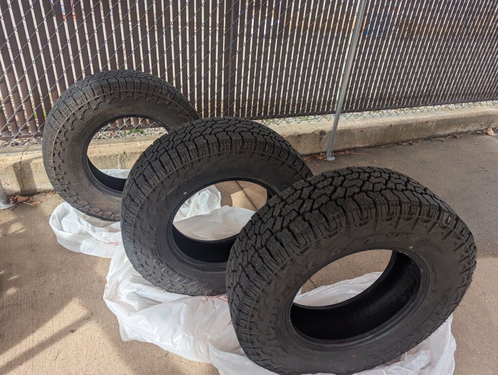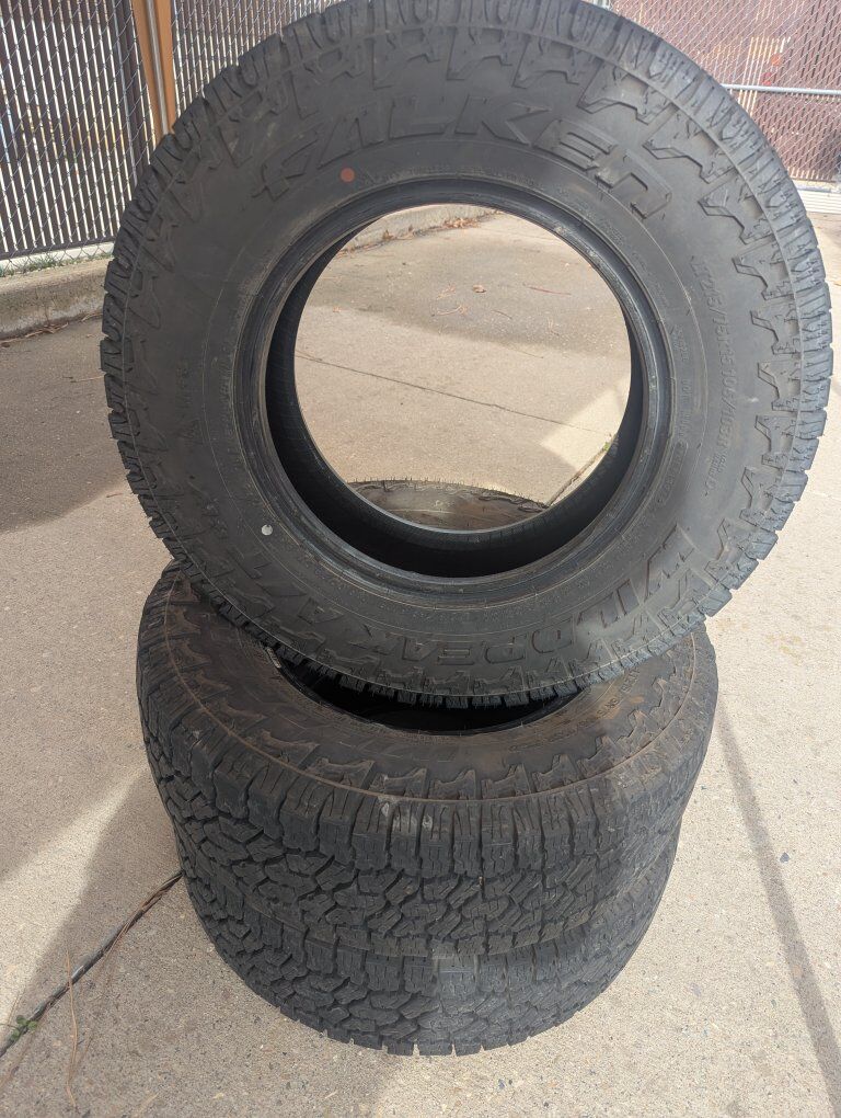 3 Tires left like new. (wheels not included, already dismounted) 60,000 miles with certificates which carry the full backing of Discount tires, including rotation and balance. 215/75 R15 Wildpeak AT4 ($188 each new without certificates) $120 each or $300 for all! Great deal, like new, with certificates!