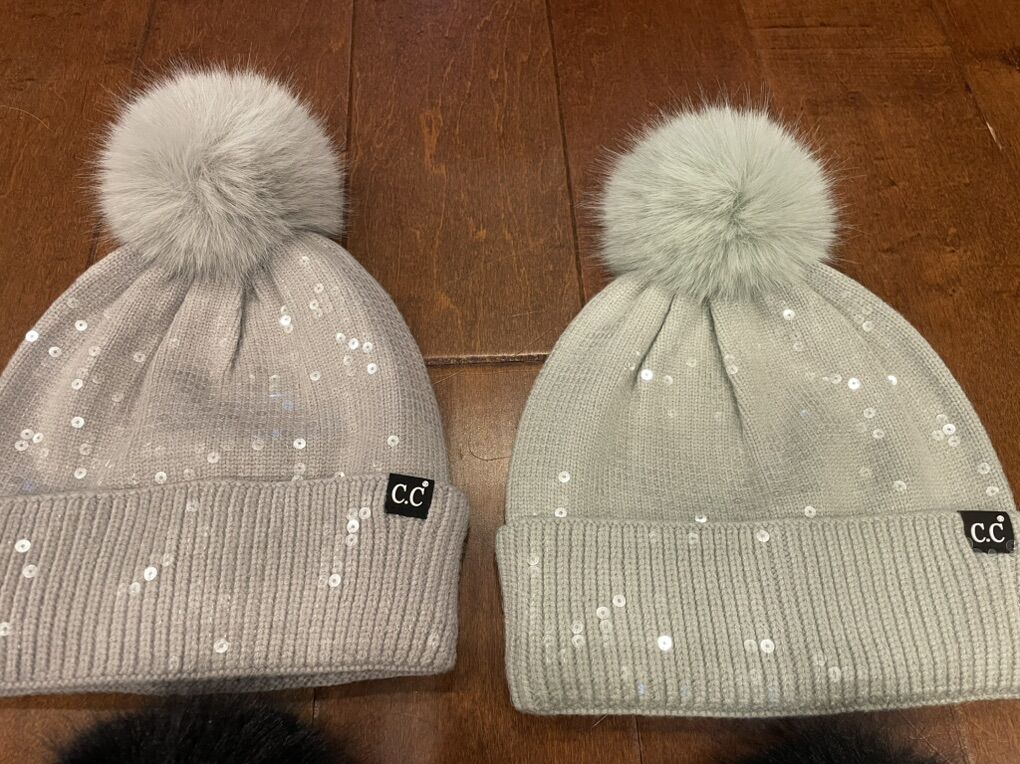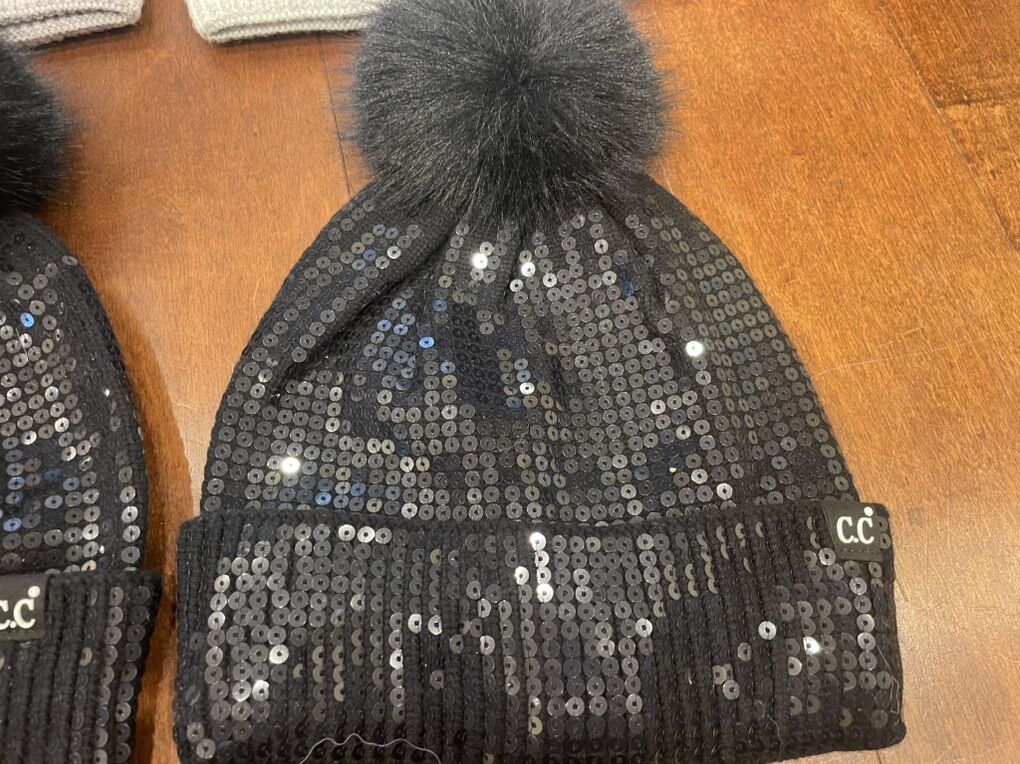 I have 6 new CC beanies covered with sequins. They have faux fur Pom Poms on top. They are very luxurious looking. 3 are black, 2 are light gray and 1 is a really pale blue. The price tags show they were originally $26 each. I’m asking $6 each or take all of them for $30. See my other ads for jewelry, artwork, home decor and more.