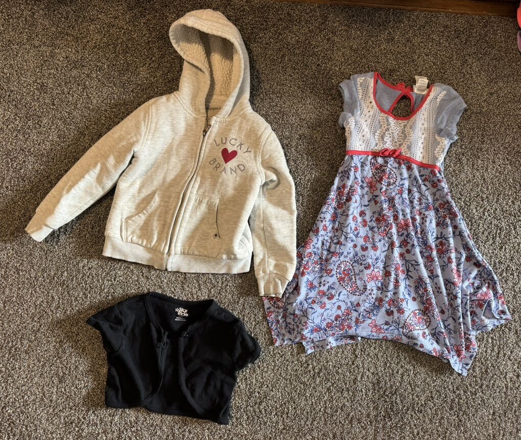 Size 5, 5/6 cute clothes. 2 pairs pjs, dress, lucky brand jacket My girl outgrew too fast, your gain!