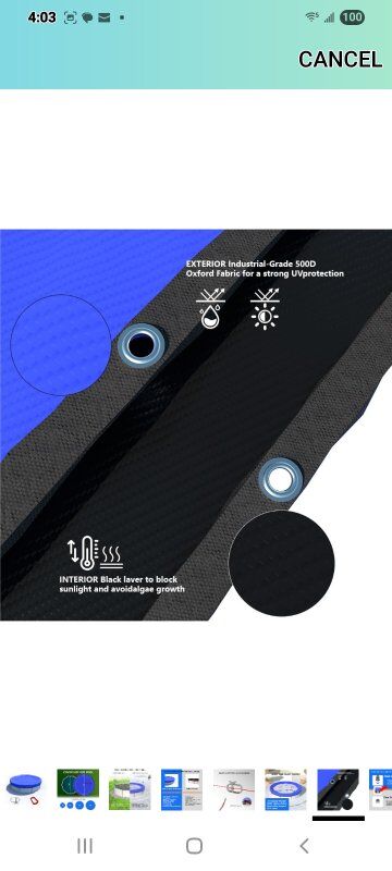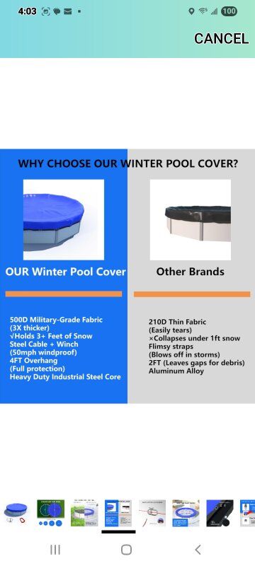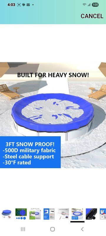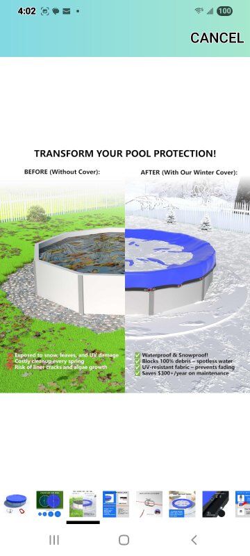 PRO-GRADE WINTER PROTECTION "The last winter pool cover you'll ever buy". ️ 500D military fabric (3X thicker than standard pool covers for above ground pools covers). ️ Withstands -30°F to 180°F — perfect for Michigan, Minnesota, Canada. ️ Reinforced seams prevent tearing under heavy snow. 2️ WINDPROOF DESIGN THAT ACTUALLY WORKS "Finally, a pool cover above ground that stays put!" Steel cable + industrial winch system. 16 grommets resist 50mph winds. Our pool covers for above ground pools 4FT overlap vs. competitors' 2-3FT . 3️ 3-SEASON SWIMMING POOL COVER ️ "Your pool deserves year-round protection". UPF50+ blocks 99% UV rays ("pool covers for above ground pools". Black underside reduces spring cleanup by 50%. Saves $300+/year on clean. 4️ 5-MINUTE SOLO INSTALL ️ "Grandma-approved setup the above ground pool covers". Pre-attached straps (no measuring), very easy to install our pool covers for above ground pools Tool-free winch tightens in 10 turns.