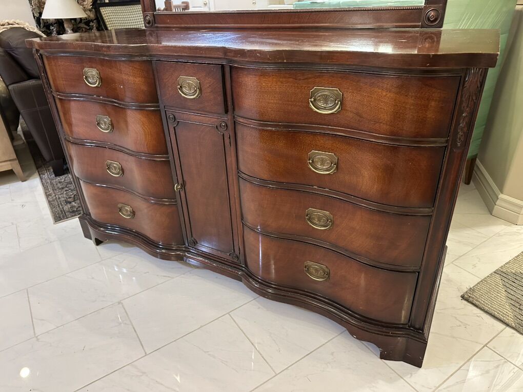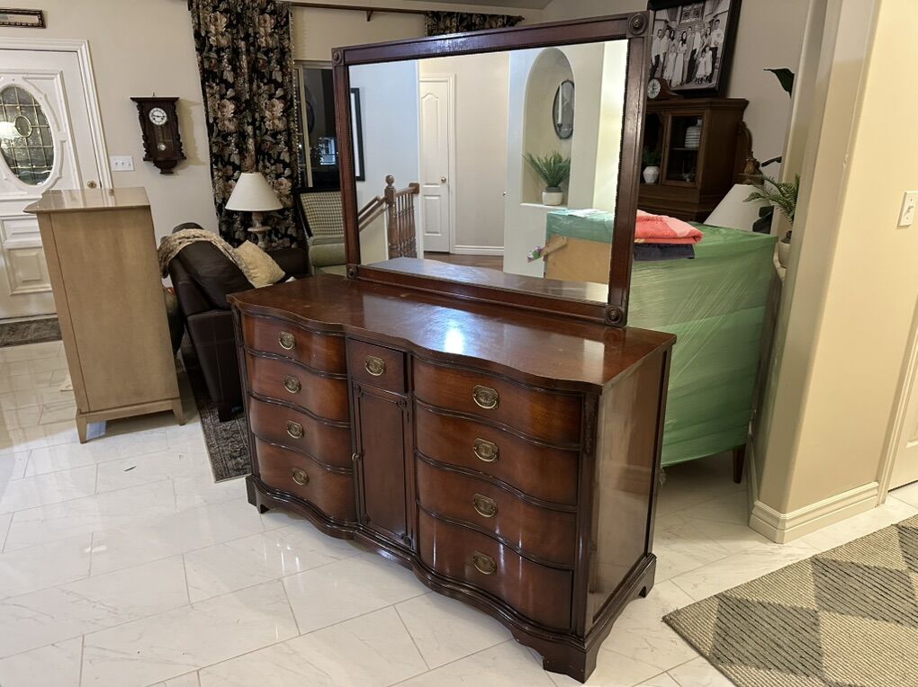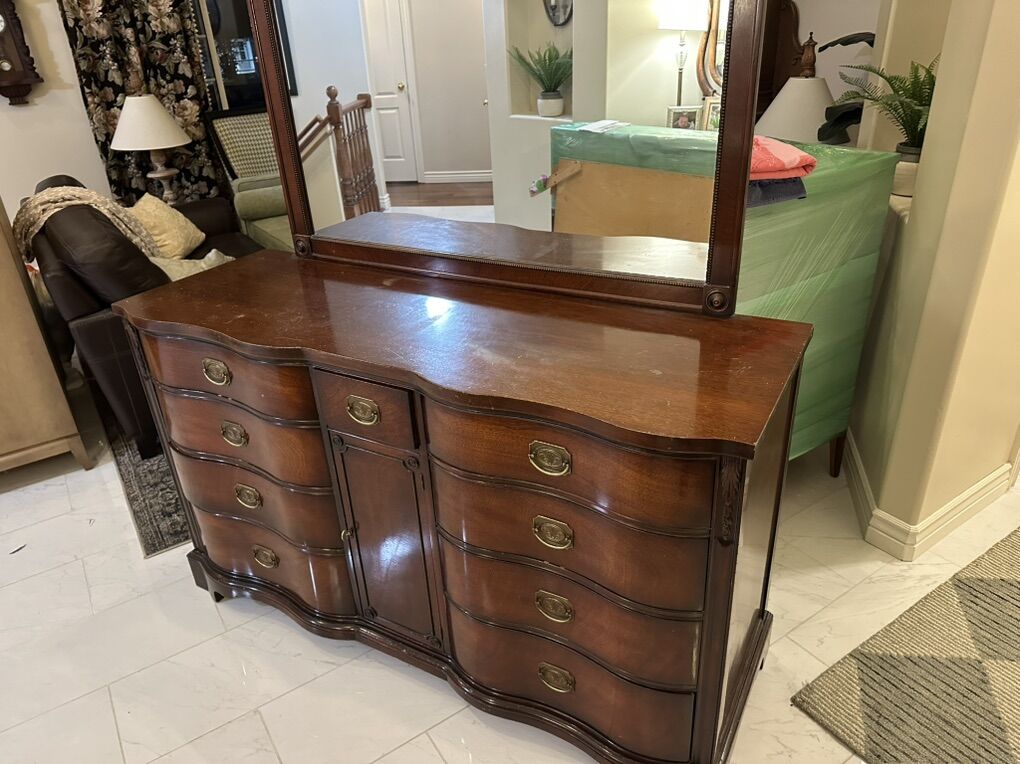 You’re welcome to call or text me at 801-319-2250. I live in Orem Utah. My name is Robb Taylor. Thanks for looking.  The mirror is 34 inches high off the dresser and 48 inches wide. The set includes a headboard and two nightstands that look similar but not matching Drexel heritage furniture. The headboard is not Drexel heritage furniture either.