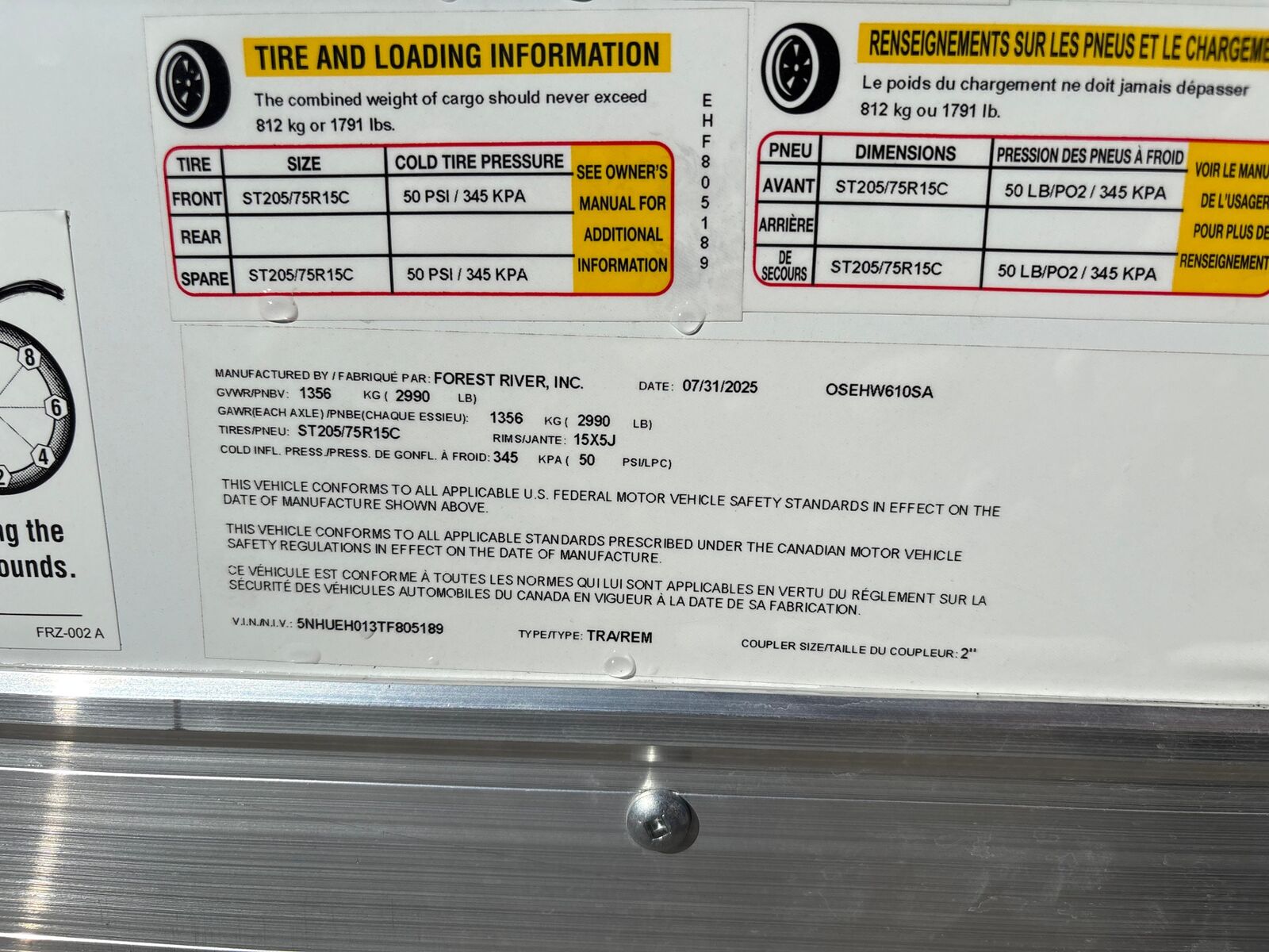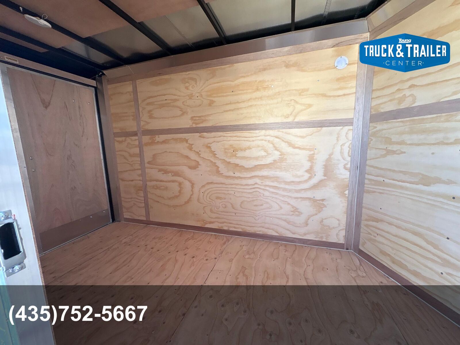 6X10 6" Extra Height • Double Rear Doors • 18” Wedge-Front Nose • C/S Door (24” on 5 wide, 32” on 6 & 7 wide, 36” on 8 wide) • Semi-Style Camlock Door Latch • Door Hold-Back on Rear Door • Leaf-Spring Axle • E-Z Lube Hubs • Silver Powder Coated Wheels • Radial Tires • Aluminum Top Rails • 16” ATP Stoneguard • (1) 12V LED Dome Light • (2) Flow Thru Sidewall Vents (on 5,6,7, & 8 wides) • Aluminum Exterior Fenders • Clear Lens LED Clearance Lights • Clear Lens LED Strip Tail Lights • DOT Lighting • License Plate Holder with Light • .030 Aluminum Exterior • Anodized Aluminum Wrap • Exposed Steel Painted Epoxy Black • Undercoated Frame • Tongue Jack with Sand Pad • Welded Safety Chains • Full-Color Decals • Flat Front w/ Anodized Corners IPO of 18” Wedge Available