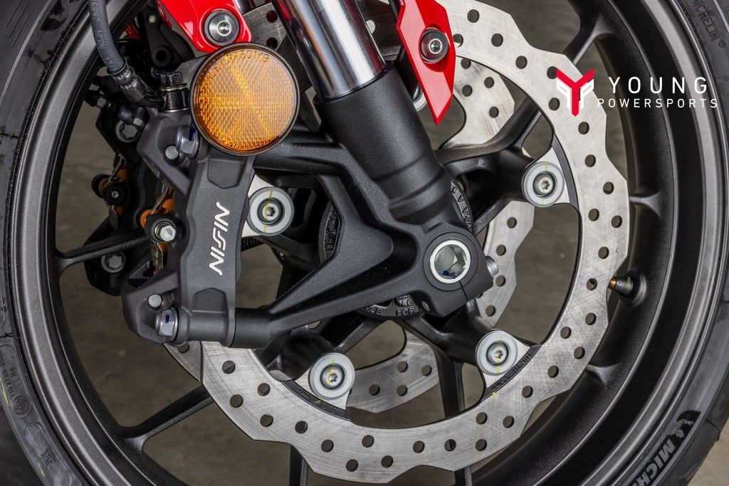 The 41mm inverted Showa® Separate Function Fork—Big Piston (SFF-BP) front end enhances the bike's rigidity and provides more precise steering input and feedback.