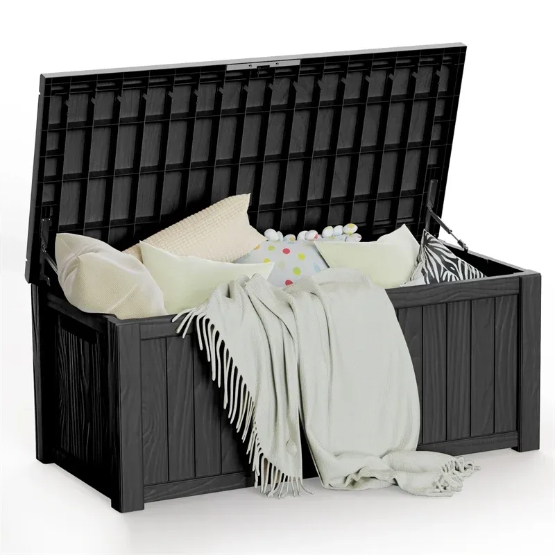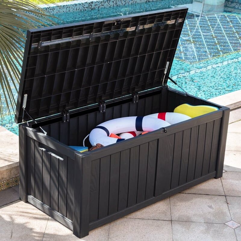 VenmoNew in Box. Multiple available. This black 72-gallon weatherproof outdoor storage box combines functionality with style. Featuring an attractive woodgrain finish and a lockable lid for security, it's constructed from durable polypropylene resin that resists rust, dents, and peeling. Designed to withstand UV rays and harsh weather conditions, it keeps contents safe and dry. The knock-down design makes it easy to clean and assemble, offering versatile storage for larger outdoor items like cushions, tools, or garden accessories on patios, decks, or in garages.Features: