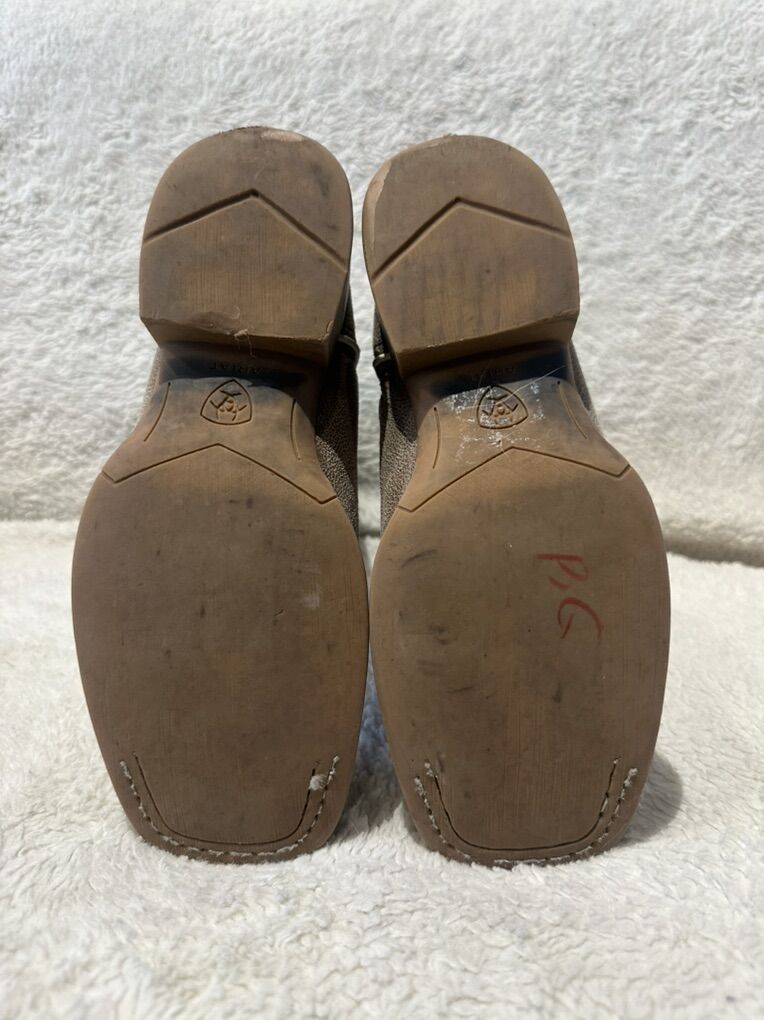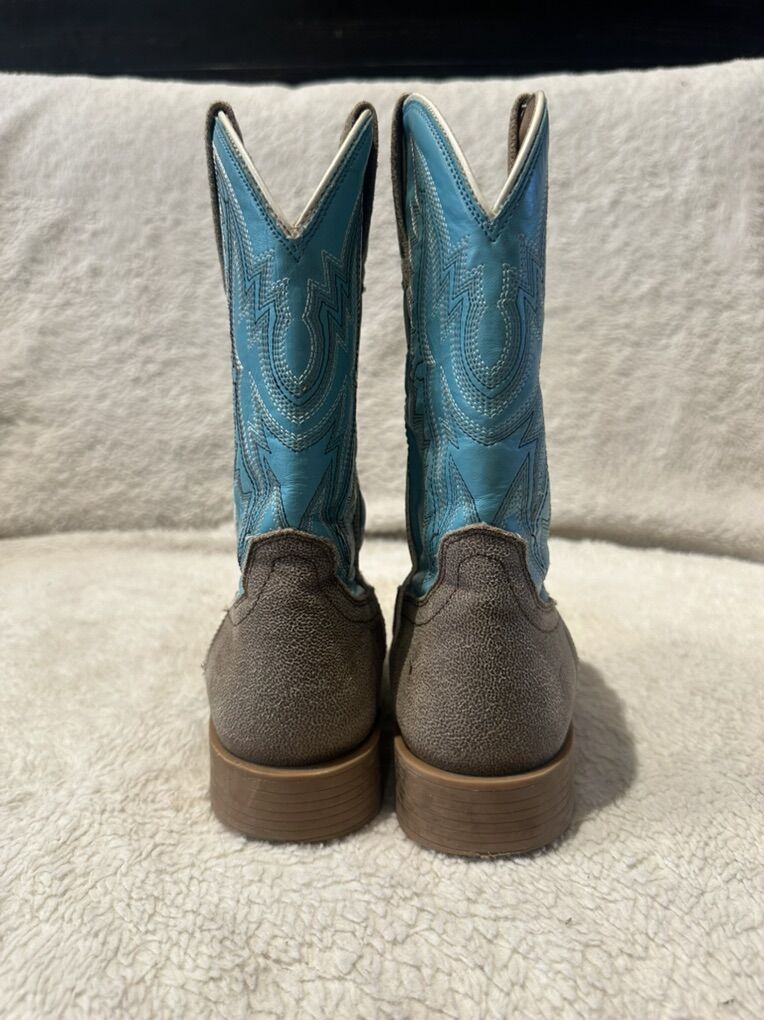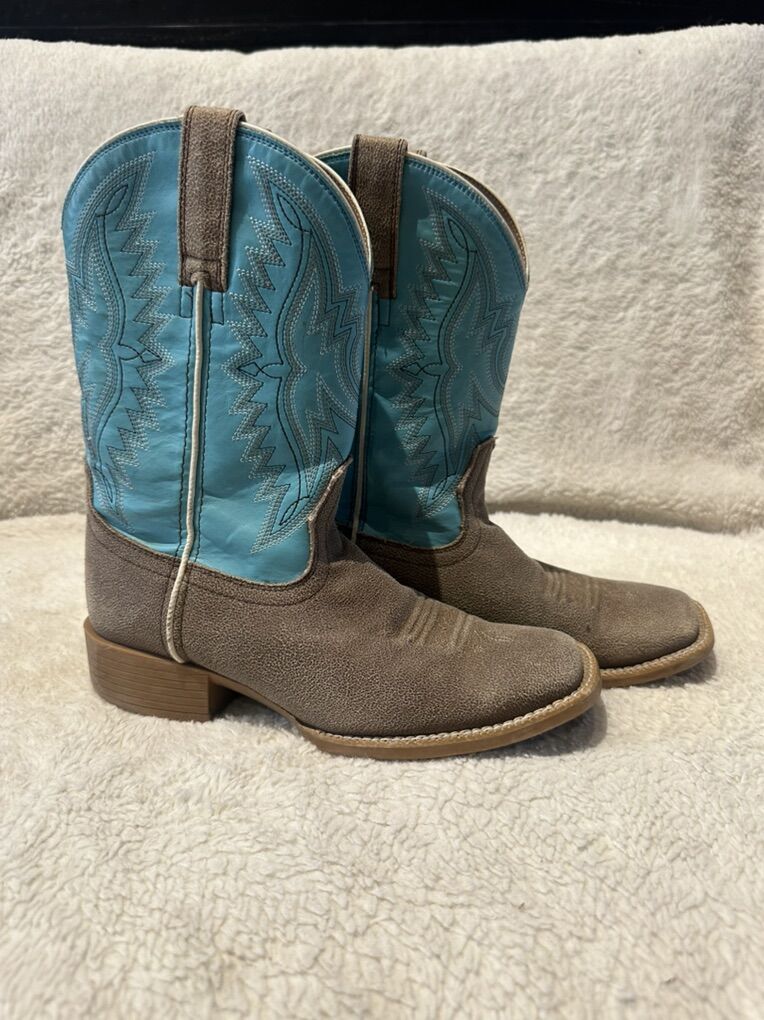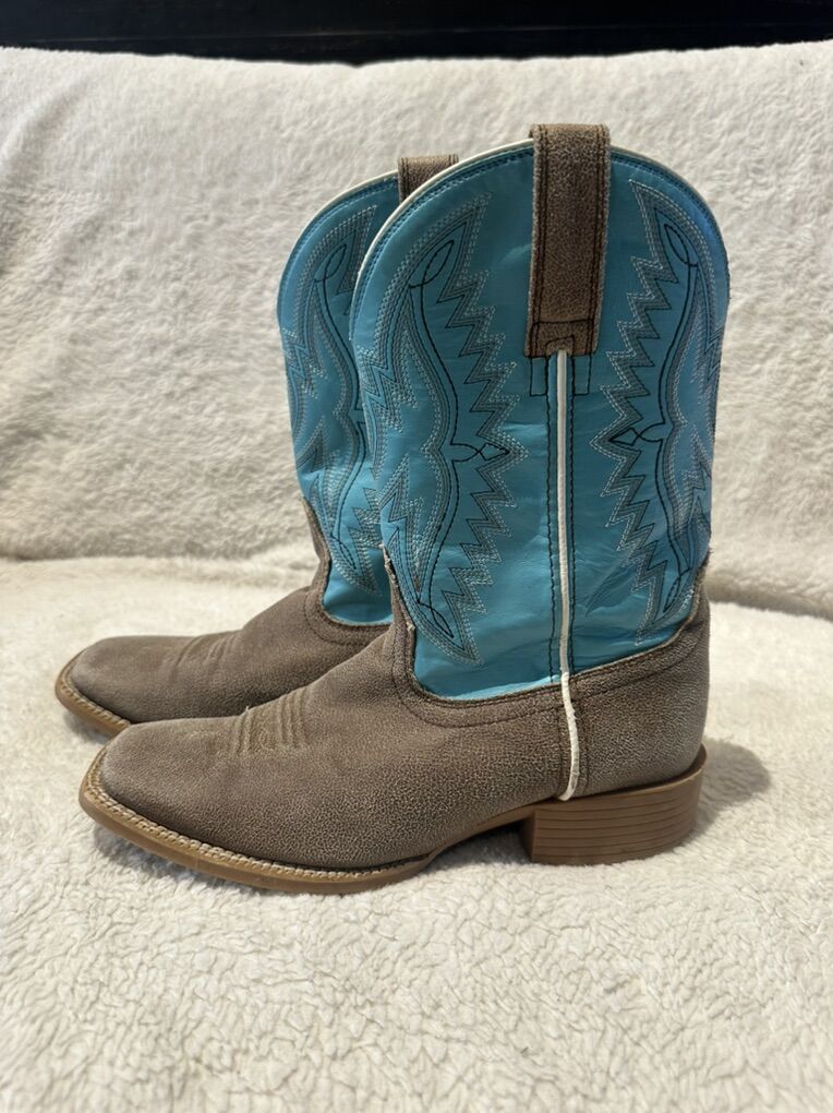 Ariat youth size 3 light brown foot bed with turquoise embroidered uppers. These western boots are in lightly used condition. See photos for details. I take cash or Venmo, but cash is preferred. Text is best. 801-201-4446. Check out my other ads for additional sizes and styles.