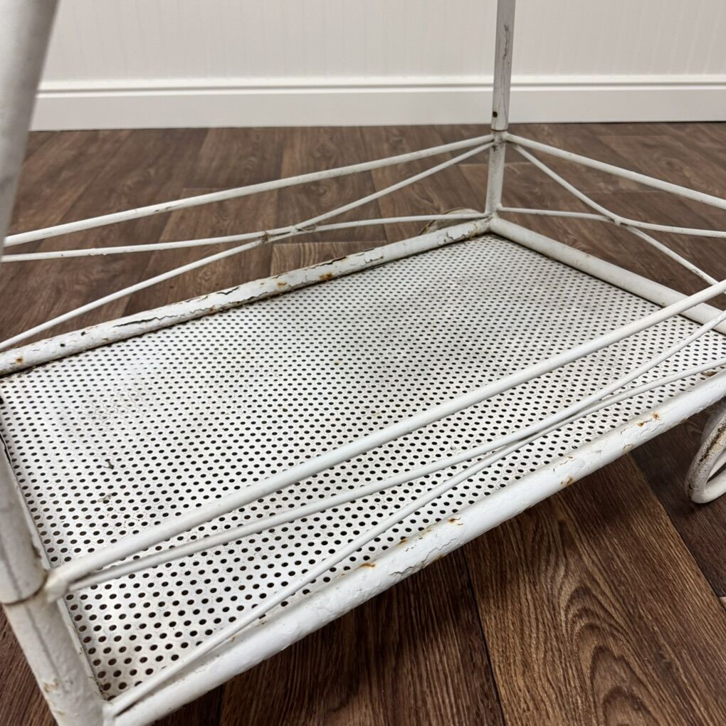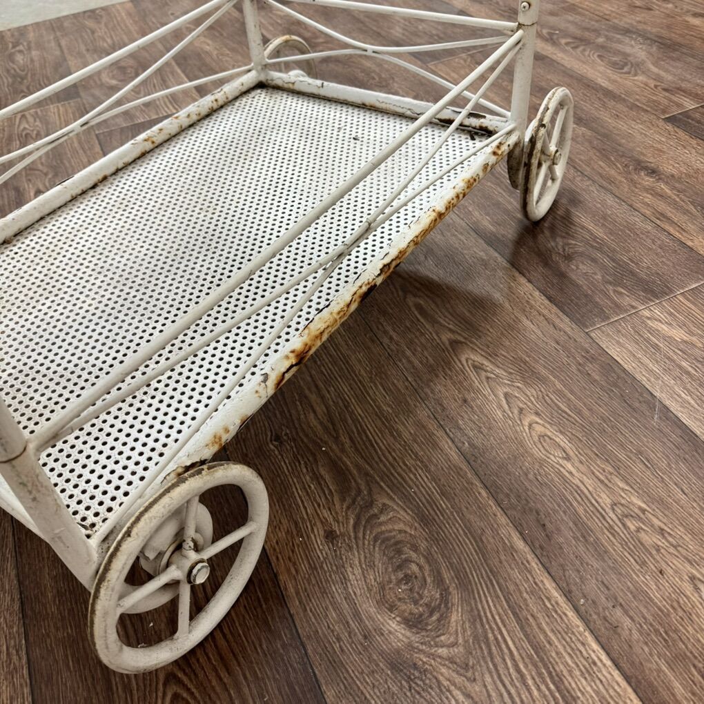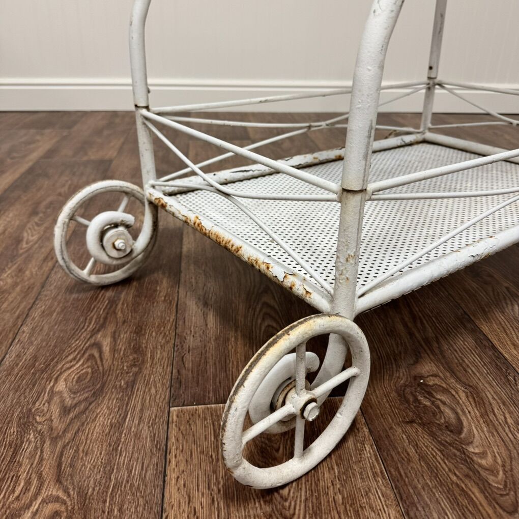 ApplePayCharming wrought iron bar or tea cart featuring a two-tiered design with mesh shelves and wheels. There are some rust spots that could be fixed with a new paint job or powder coat. A perfect complement to any patio set.