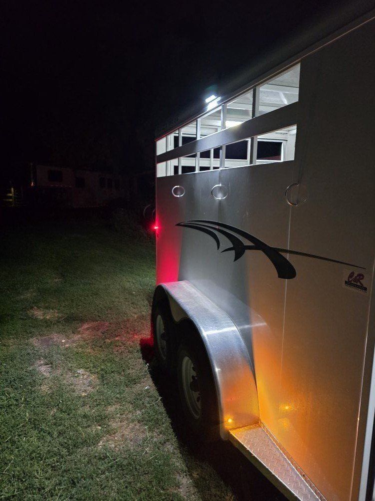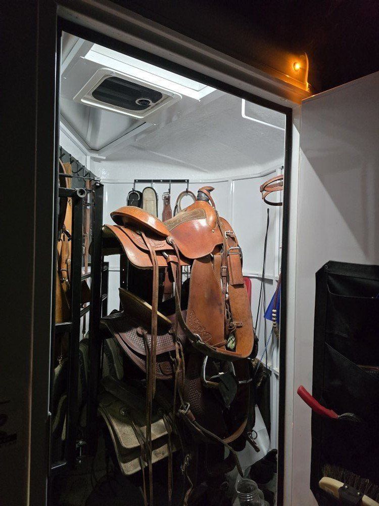 3 horse slant load bumper pull ~Front tack room with pull out saddle rack for easy saddle access ~Water tank for longer trips (Will fill if requested before you pick it up) ~Hay nets for longer trips (Can load them with grass hay for $6 a bag) ~LED lights on all 3 sides as pictured. Tack room lights, and hauling area lights ~Bumper pull