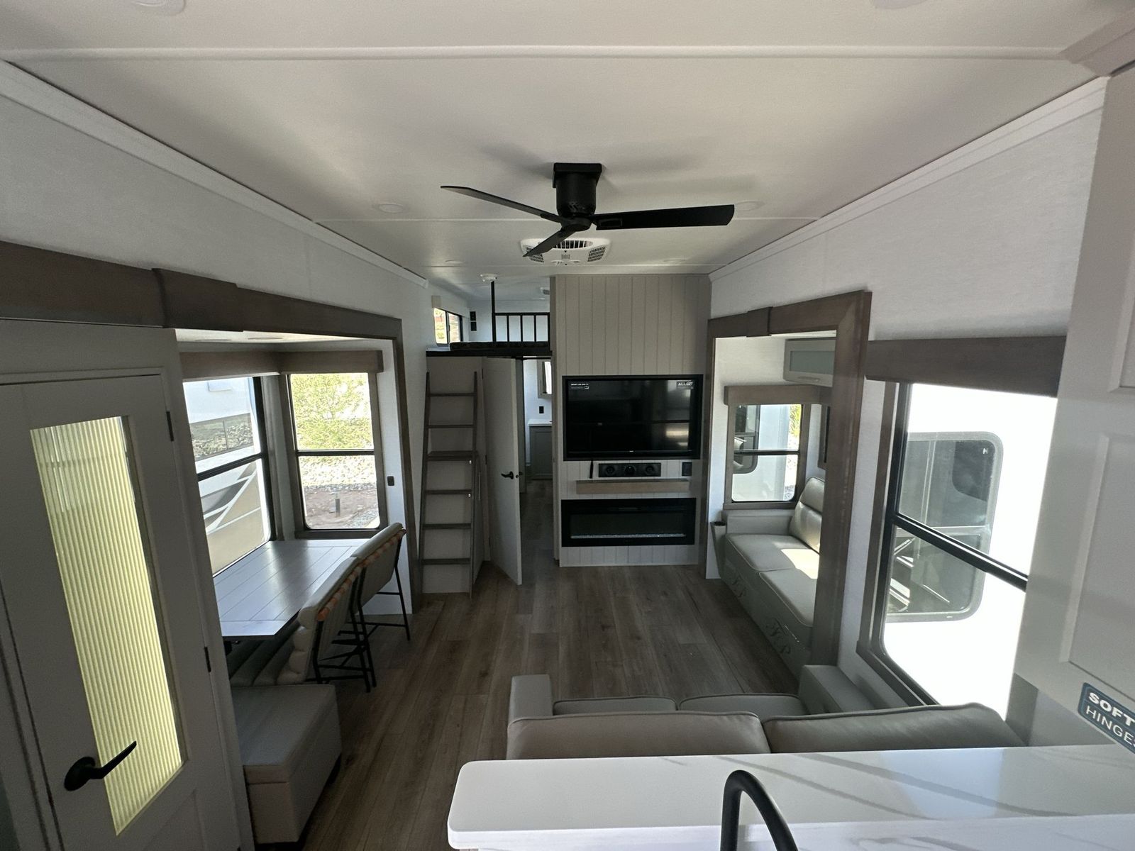 Alliance Paradigm fifth wheel 395DS highlights: Two Full Baths Two Full Bedrooms Loft 19 Cu. Ft Residential Refrigerator Dual Recliner Loveseat King and Queen Beds Fireplace A spacious unit with sleeping for eight with plenty of choices to suit everyone! There is a front private bedroom with aking size bedthat offers a large full front closet that has also been prepped for a washer and dryer if you choose that option. The front bath features a 40" x 30" shower and dual entry. Head down to the kitchen and living space at the bottom of the stairs to find a curbside slide that houses the 19 cu. ft. residential refrigerator, a pantry, and a swivel table and desk. As you continue on toward the rear of this coach, you will find a spacious living area along the roadside with a 50" Smart TV and afireplace, a sofa sleeper slide, and a dual reclining loveseat. This makes a great gathering place for television watching, game playing, and even added sleeping space if needed at night. The rear private bedroom with its own private bath features a queen bed, two closets, and a Smart TV as well. The multipurpose loft area above can be accessed just before this rear bedroom entry by a ladder, and it is perfect for extra storage, or it can be used for added sleeping that the kiddos are sure to love. The Paradigm fifth wheels by Alliance RV are functional, high-quality, and luxurious for an unforgettable camping experience. There are three A/C units and a 40K BTU furnace to keep you comfortable year around, and you'll appreciate additional convenient amenities, like the all-in-one enclosed/heated utility center and the color coded and numbered wiring. AHelux Series coil spring pin box comes standard for hassle-free towing, along with Super-G 4,400 lb. rated tires and Dexter 7,000 lb. axles. You'll love the kitchen with its LG solid surface countertops and Lusso range, plus there is LED motion lighting in the pantry and a Maxx fan with a rain sensor to keep everything fresh when making dinner. Each model also includes an HD Smart TV in the living room and bedroom, plus a Winegard Air 360 antenna to keep you connected to the outside world. And of course there are a variety of options you can choose from to further customize your fifth wheel; dual pane windows, Super Solar Plus, slide out awning toppers, and generator prep or a generator to name a few!