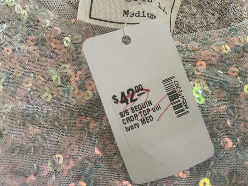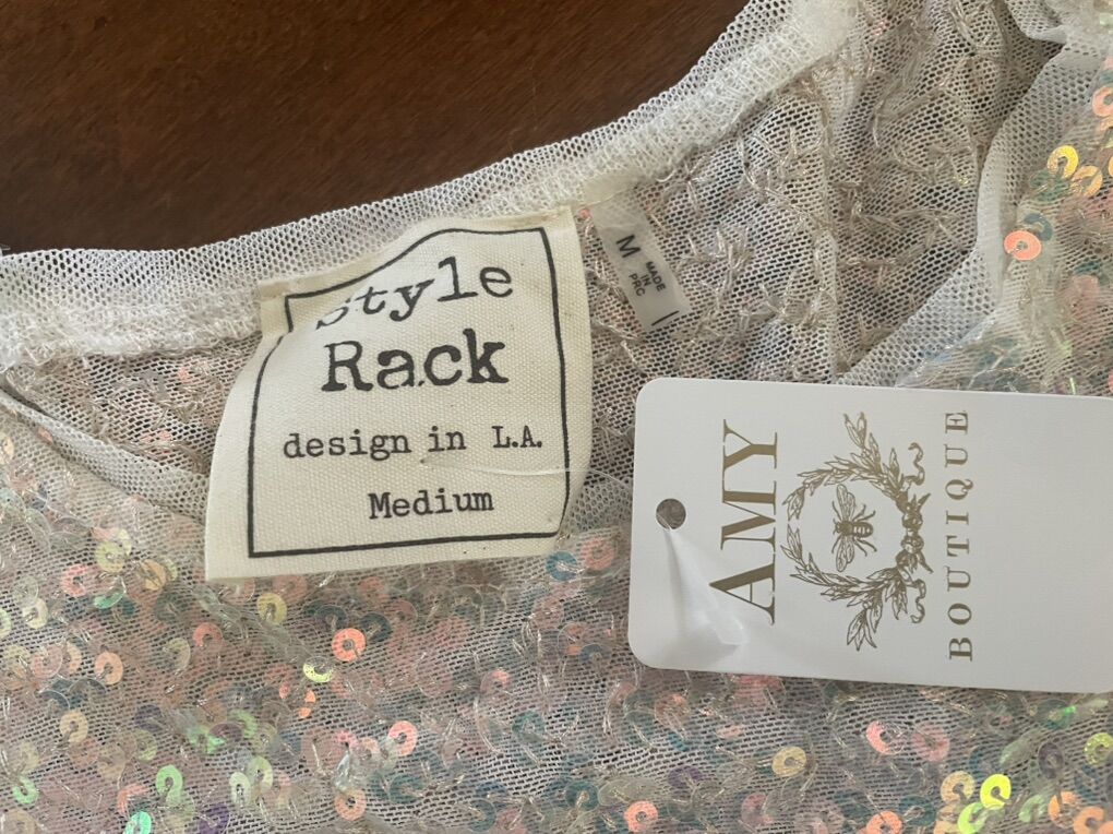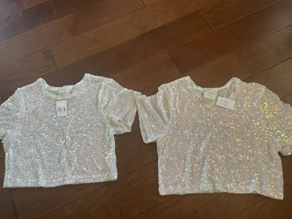 I have 2 new white crop top shirts covered in iridescent sequins. They are made by Style Rack and were sold at Amy Boutique. One is a small and the other is a medium. The price tags show they were originally $42 each. I’m asking $5 each or take them both for $8. See my other ads for jewelry, artwork, home decor and more.