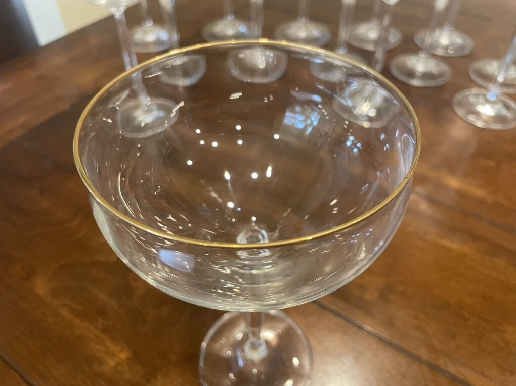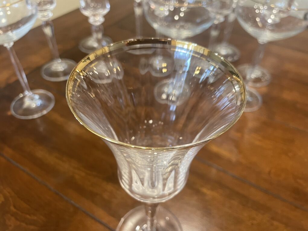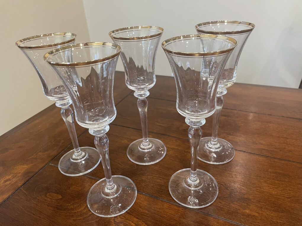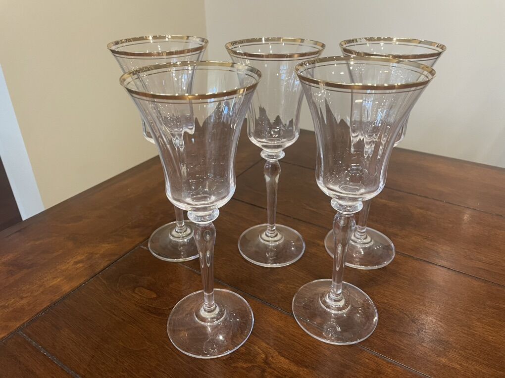 I have a set of beautiful Mikasa Jamestown blown glass stemware. They have a wide gold band around the top with a narrow band underneath. There are 5 water goblets, 5 wine glasses and 4 margarita glasses. The water goblets are 9 inches tall and 3 3/4 inches across. The wine glasses are 8 5/8 inches tall and 3 1/8 inches across. The margarita glasses are 7 3/4 inches tall and 4 1/4 inches across. I’m asking just $85 for all of them together. See my other ads for jewelry, artwork, home decor and more.