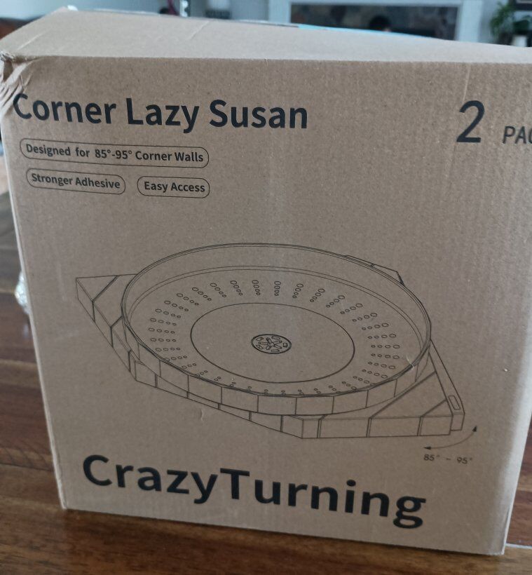 In box - tried one but it was too large Compare on Amazon for over $30. Made for corner walls that 85-95 degrees. Comes with two shelves.