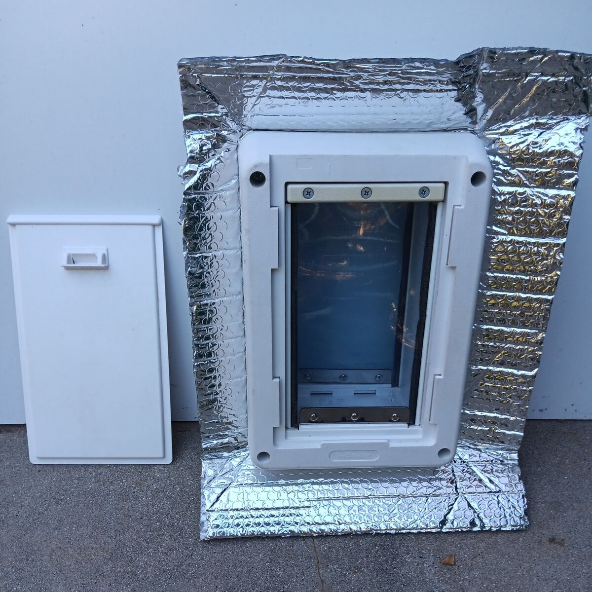 This pet door is in excellent condition. Designed for colder climates it has 2 vinyl entry flaps. Door opening is five inches wide by nine inches tall. It has a security plate That locks and place.