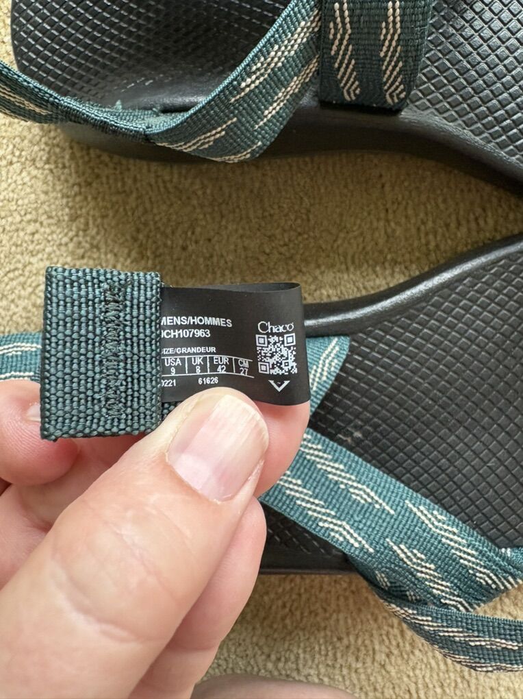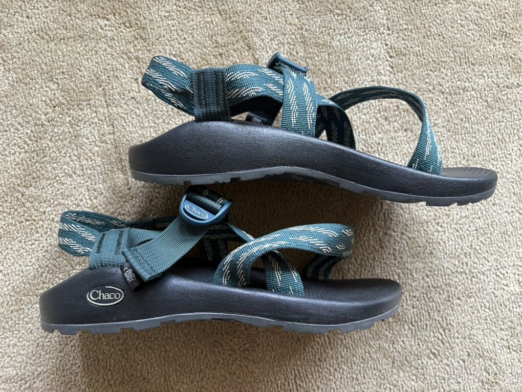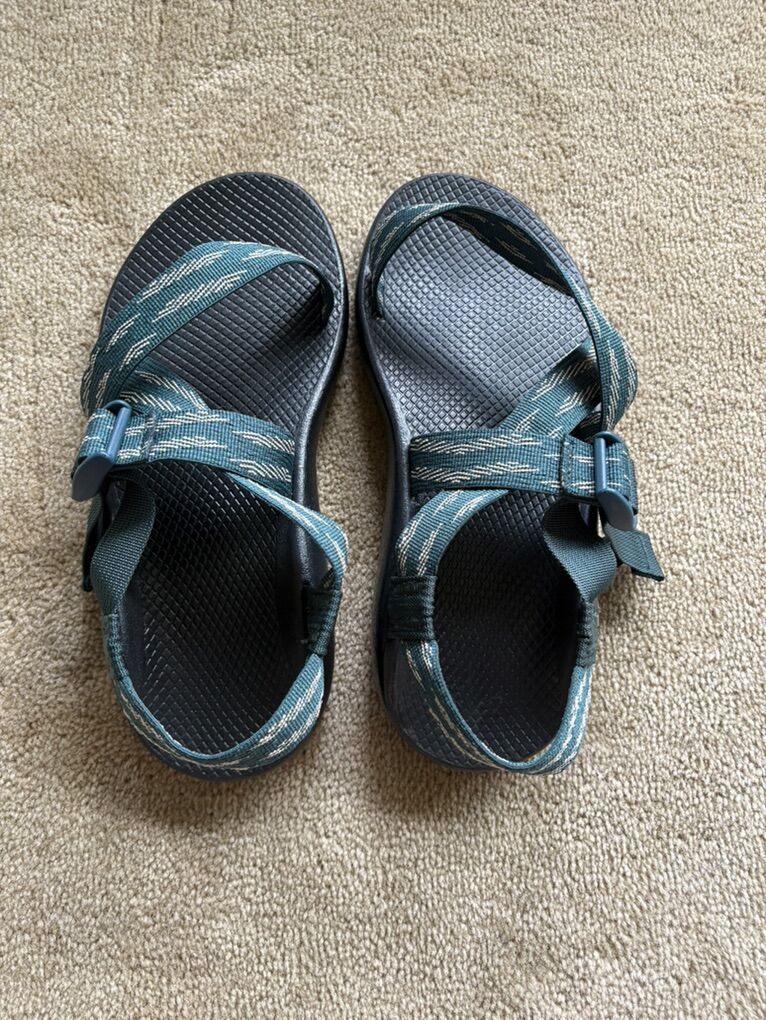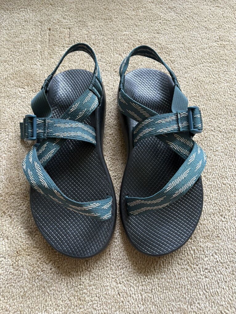 Authentic Chaco Z/1 waterproof hiking sandals, Green with tan pattern, men's 9 (EU 42). Wide adjustable straps, sturdy Chaco soles. Very good condition. Text only. Cash or Venmo.