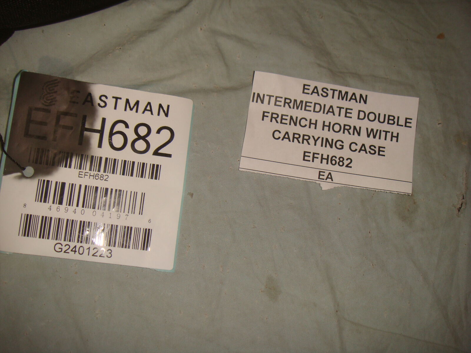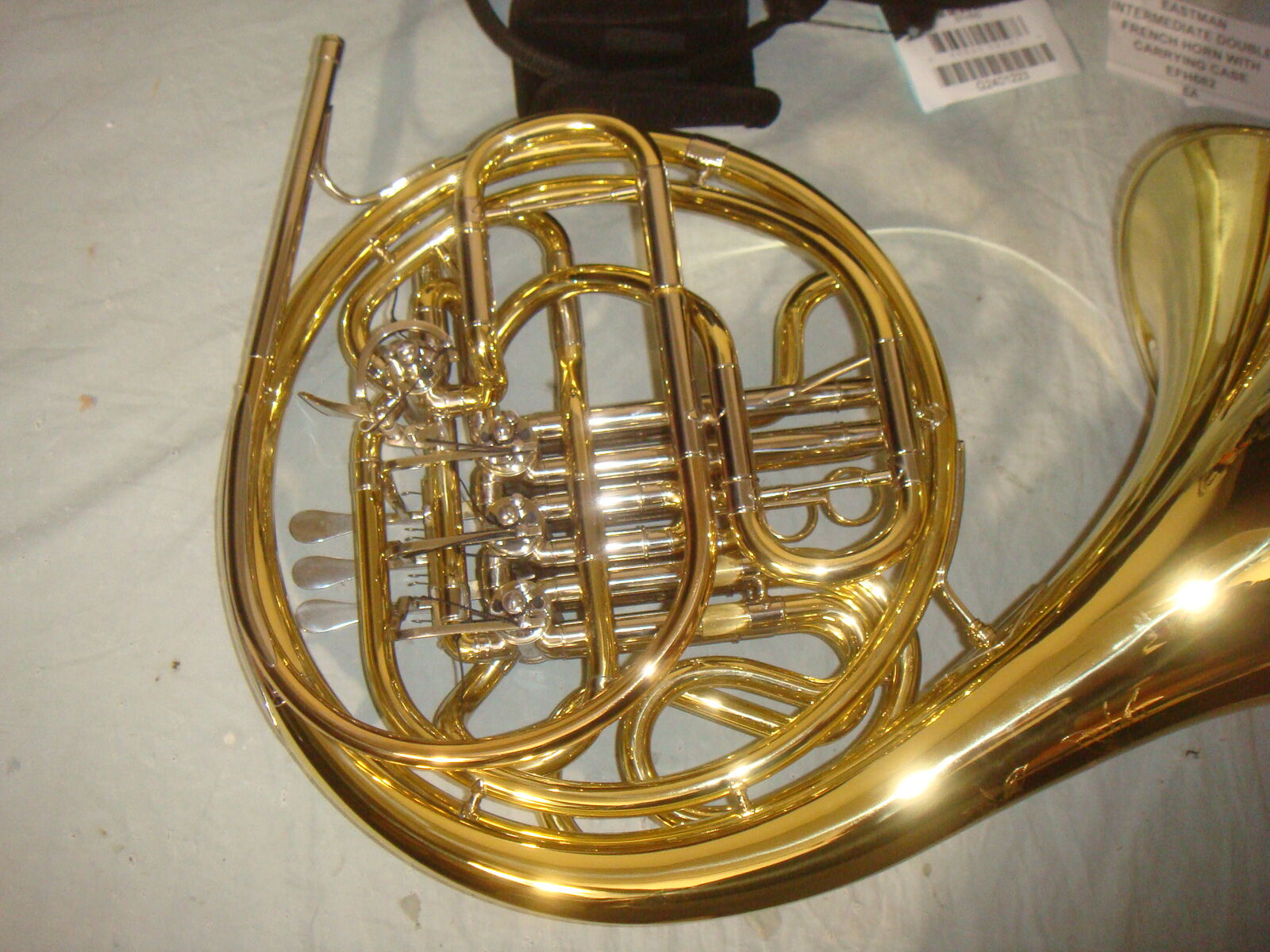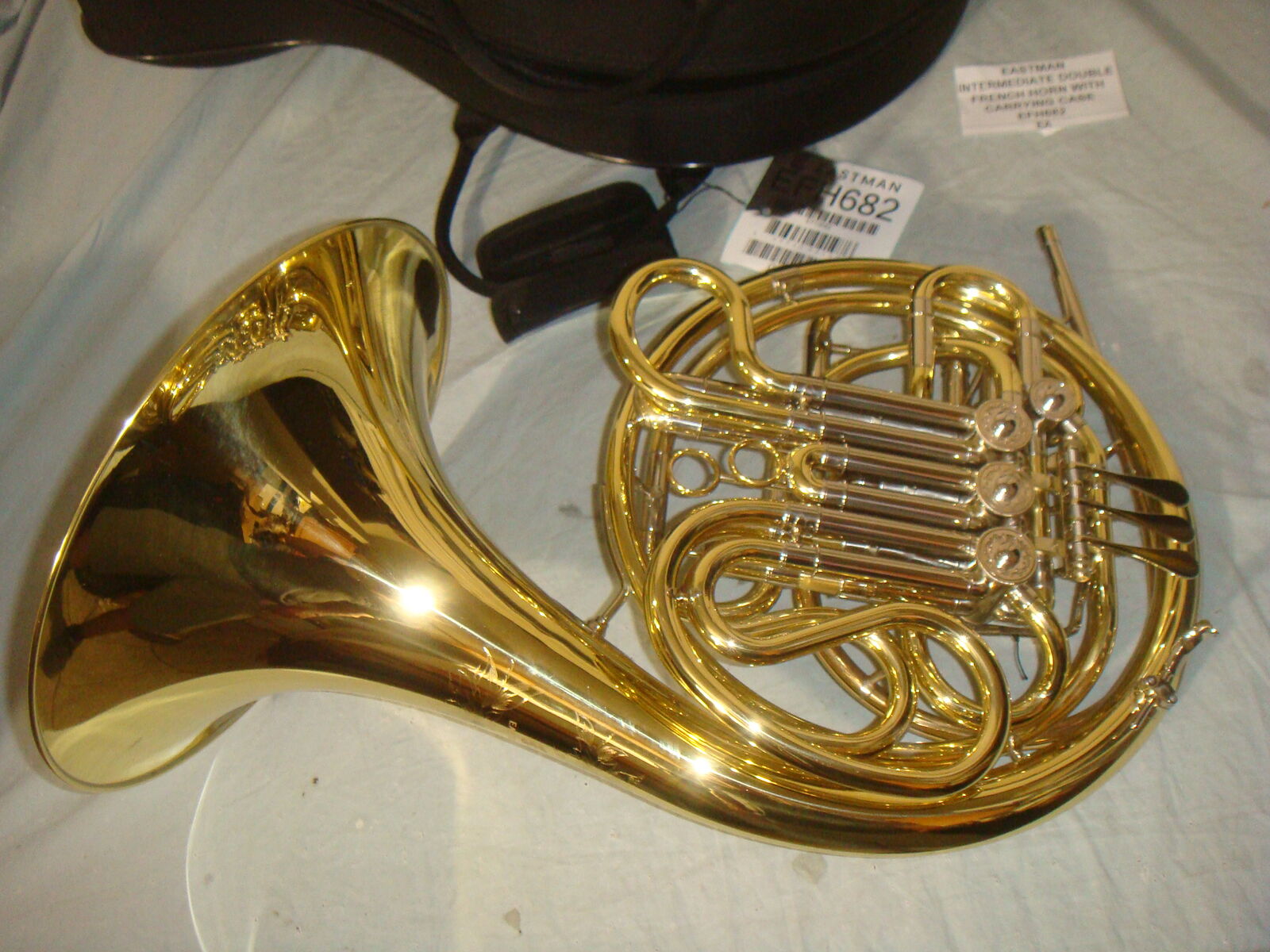 EASTMAN EFH682 INTERMEDIATE GOLD BRASS BELL DOUBLE FRENCH HORN W CASE! This is a brand new, never used, absolutely beautiful, open box French Horn. It has never been played. It does not include the original box/packaging, but is otherwise brand new and in new, perfect condition. It comes with a beautiful lightweight protective carrying case and mouthpiece. This is their higher end performance series French Horn that sells for $4900. It comes with everything shown. Even the lower end beginner student model sells for much more than our asking price, and this is a superior instrument. This is your chance to save big-time so don't miss out!!