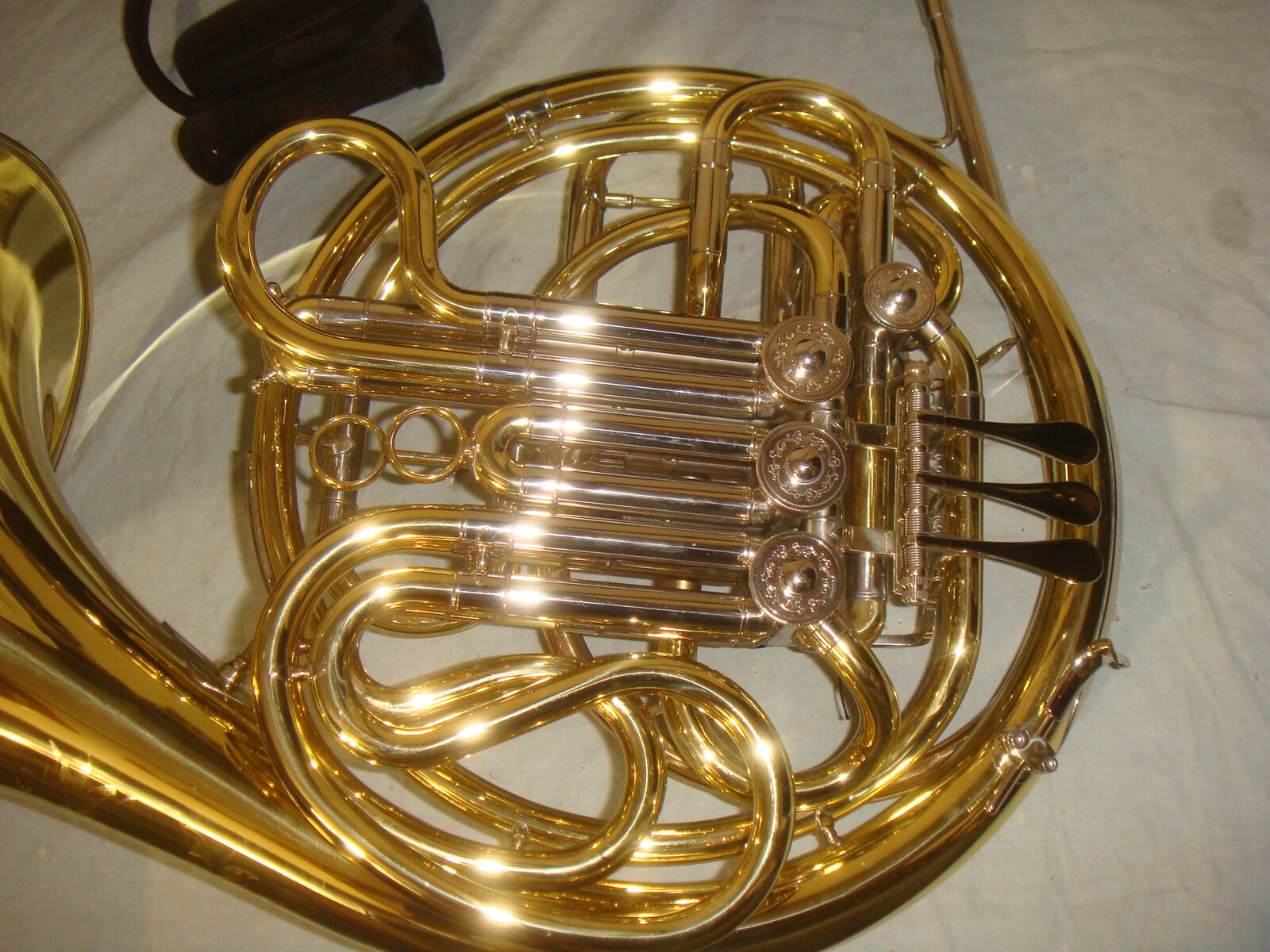 Key of F/Bb Double Horn, .468” bore Geyer-Knopf style wrap Handspun yellow or gold brass bell Adjustable finger hook Engraved bell and valve caps Clear lacquer finish Laskey 75G mouthpiece and case included