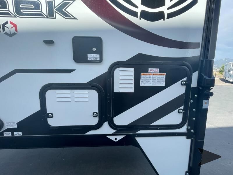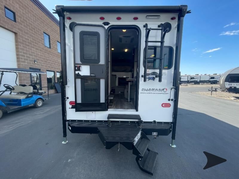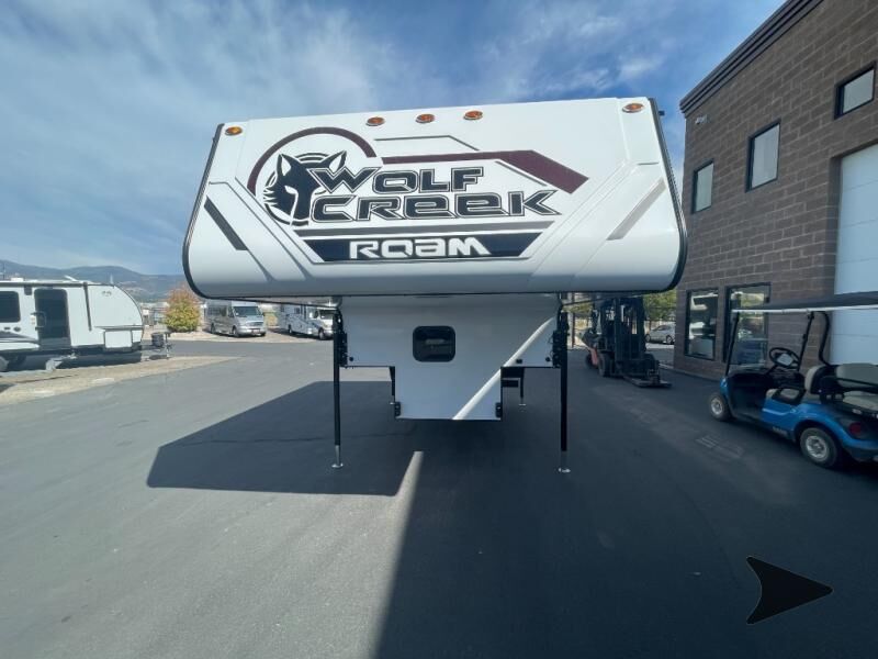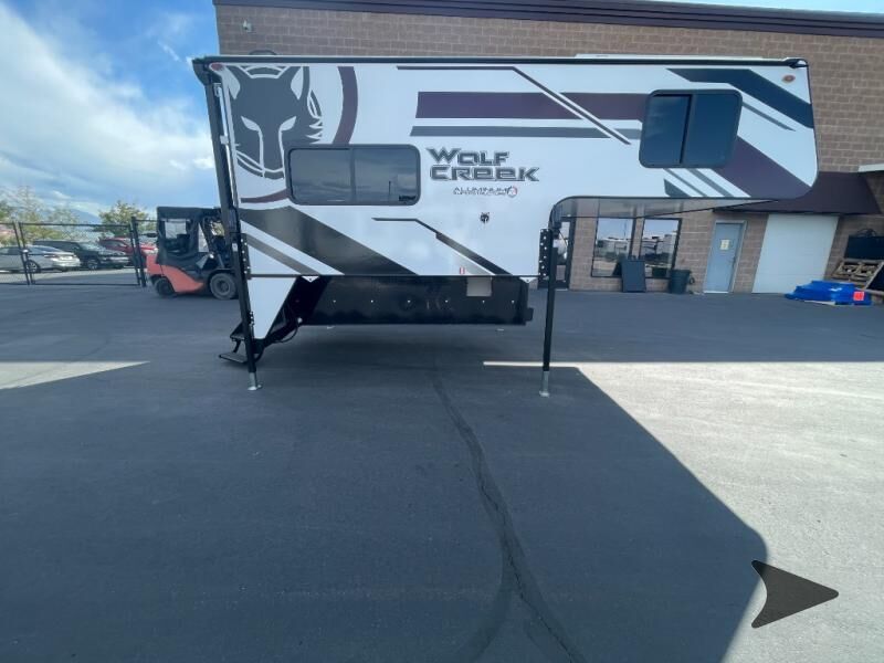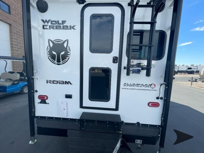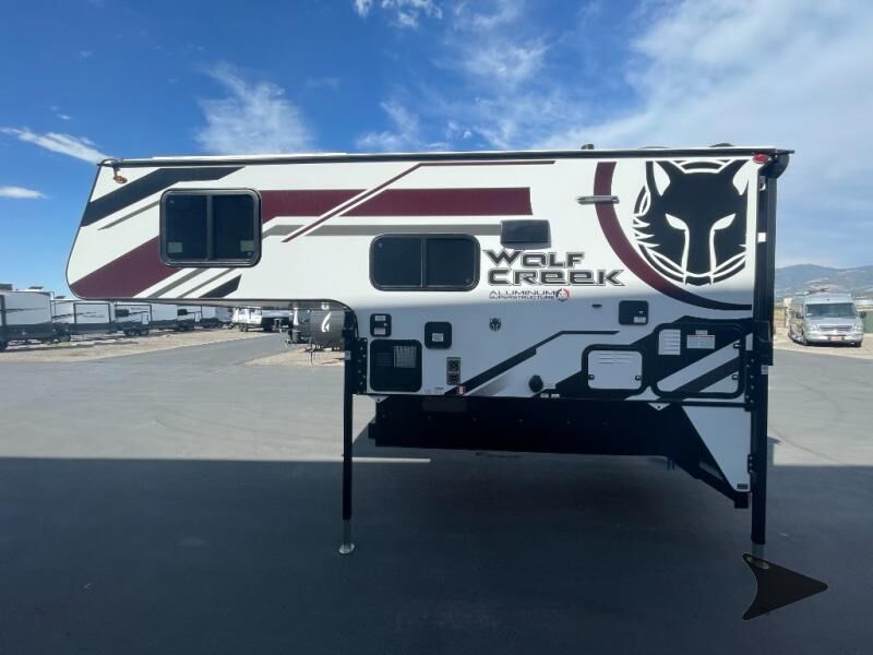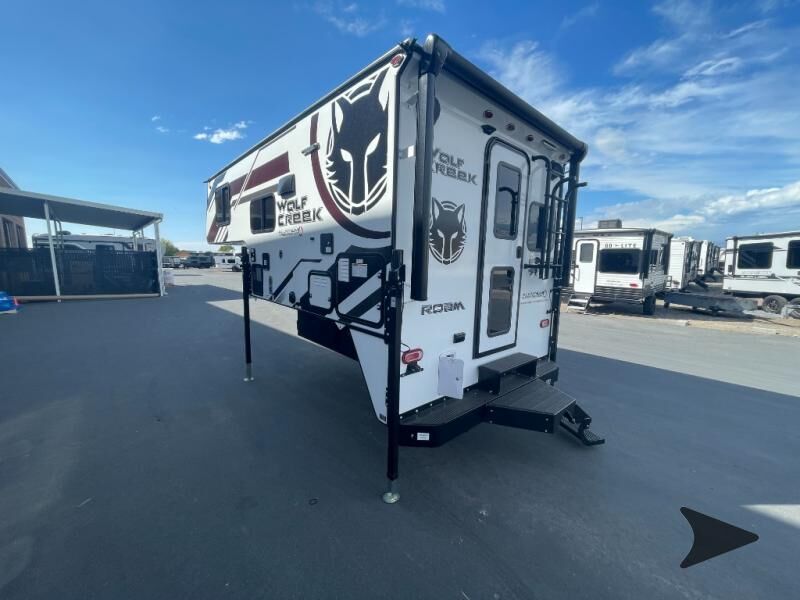 Northwood Wolf Creek truck camper 850 highlights: Wet Bath Pantry Three Wardrobes U-Shaped Dinette 8 Cu. Ft. 12V Refrigerator Head across the states in this comfortable truck camper for four. Once you find a campground to park for the night, start lunch on the three burner cooktop, or use the residential microwave with an air fryer for a quick meal. The U-shaped dinette will be the perfect place to dine at, or you can choose the optional roll-over sofa here. The dinette converts to a 38" x 77" sleeping area, plus there is an overhead bunk. You will enjoy the front 58" x 80" queen bed that includes three wardrobes and a nightstand for your things, and don't forget to add the optional 24" 12V LED TV for movies in bed. With any Wolf Creek truck camper by Northwood you can camp year around thanks to the high density block foam insulation, thermal pane windows, and the multi-layered substrate walls. The durable fully welded, thick-wall aluminum frame construction will add durability, and the Corona treated fiberglasswill help combat leaks so you can enjoy your camper for years to come. Each model includes fabric night shade window treatments, custom one-piece formed countertops and dinette table, hardwoodcabinet doors, and many more comforts. You will love the high value features included within the Wolf Pack, such as a Fox Landing ready rear bumper, a premium vent, electric jacks, and outside speakers.