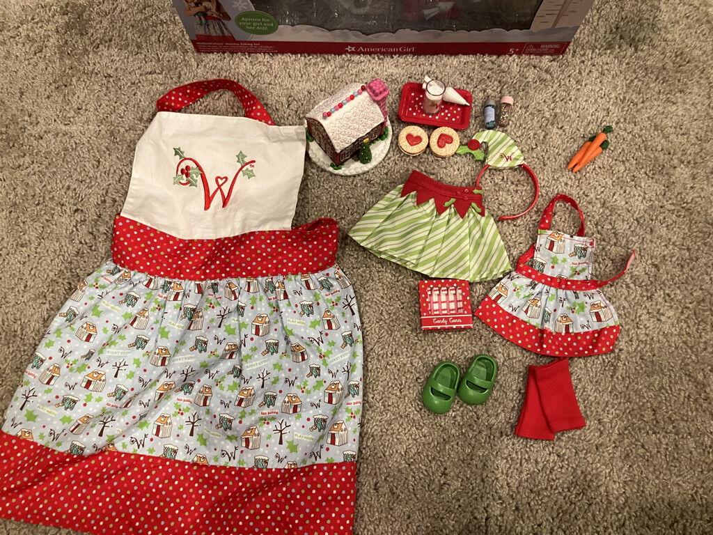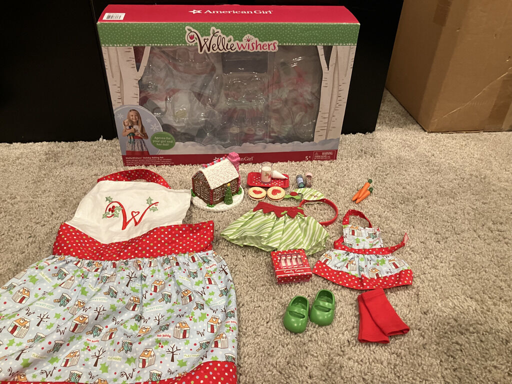 American Girl Wellie Wishers Holiday Baking Set Includes: Gingerbread house, Candy cane box, plus blue and pink sprinkles, and a piping bag for pretend decorating, Elf top (missing), skirt, and headband, Pair of shoes, Set of legwarmers, Tray that holds a glass of milk and 2 cookies for Santa, Holiday card (missing), Bunch of carrots for Santa’s reindeer.