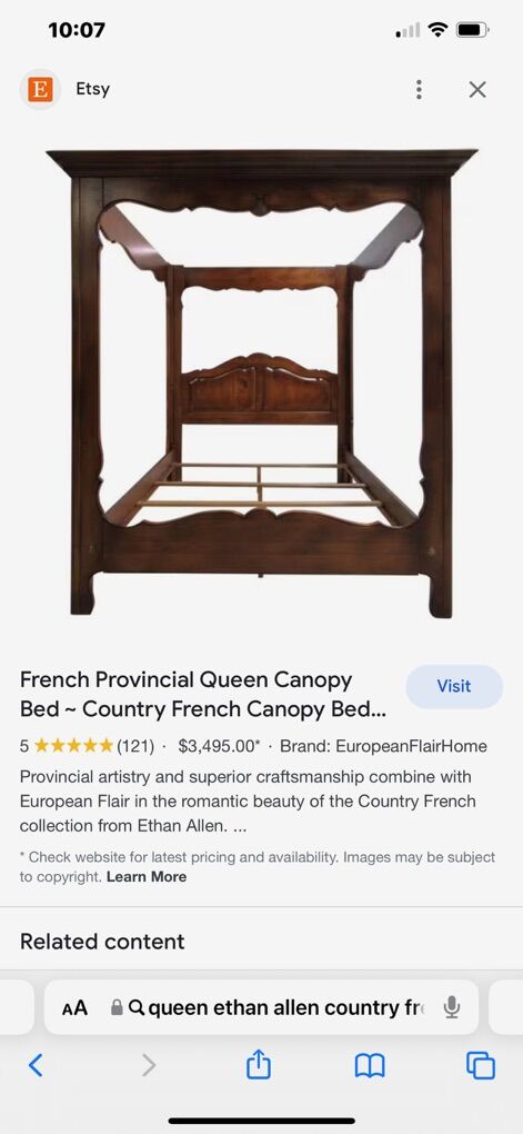 ApplePayWe purchased this bed new from Ethan Allen. Only selling because we downsized and no longer have room for it. It does have a few scratches but with the right know-how, could be fully restored to look like new. Each piece is currently individually wrapped in a blanket and it’s in a climate-controlled storage unit. Priced to sell. Will not respond to offers. Thanks.