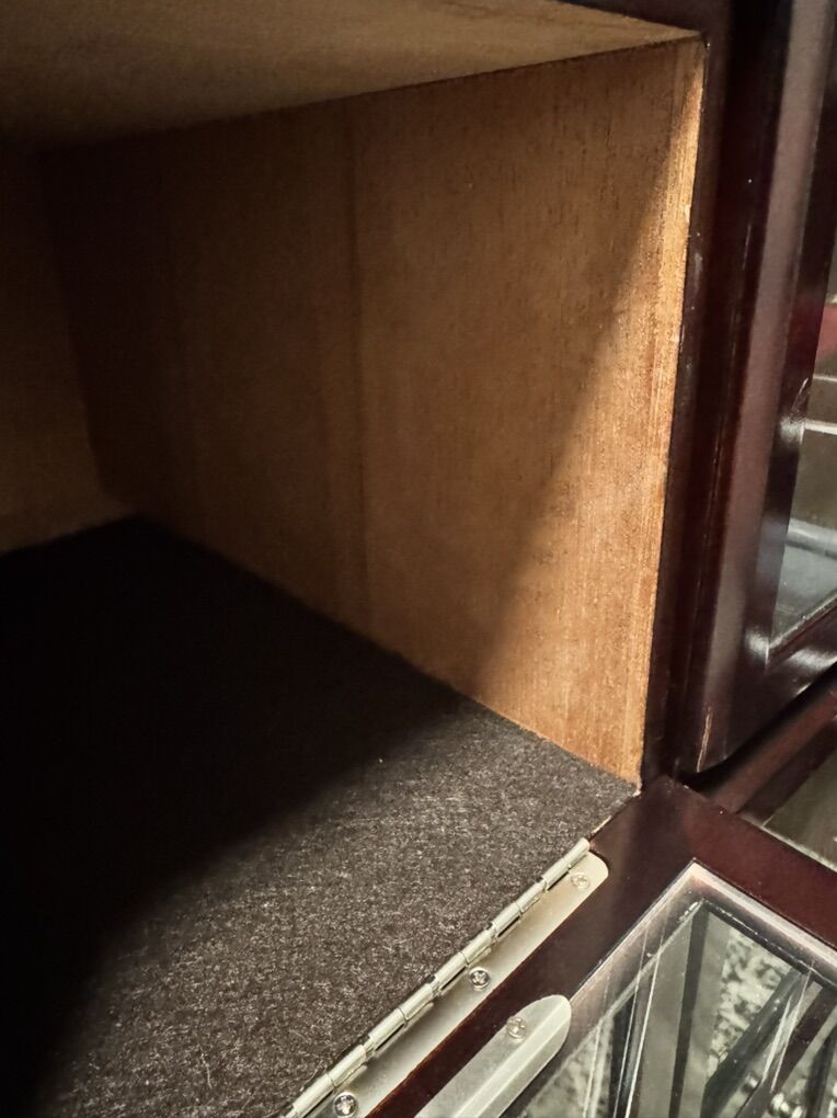 Details: Tempered Glass Front with Magnetic Closure Spanish Cedar Mahogany Color 15”L X 8”W X 8”H 7.6 Pounds