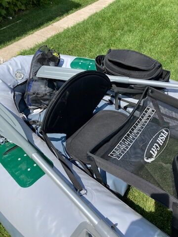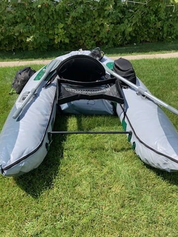 Fish cat pontoon boat 7ft long. 54” wide Includes pump - life jacket- Storage bag Neoprene waist pants Paddles Can deliver to Utah county $1500.00 retail worth of stuff New Only $800.00