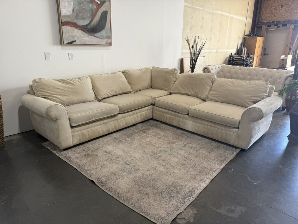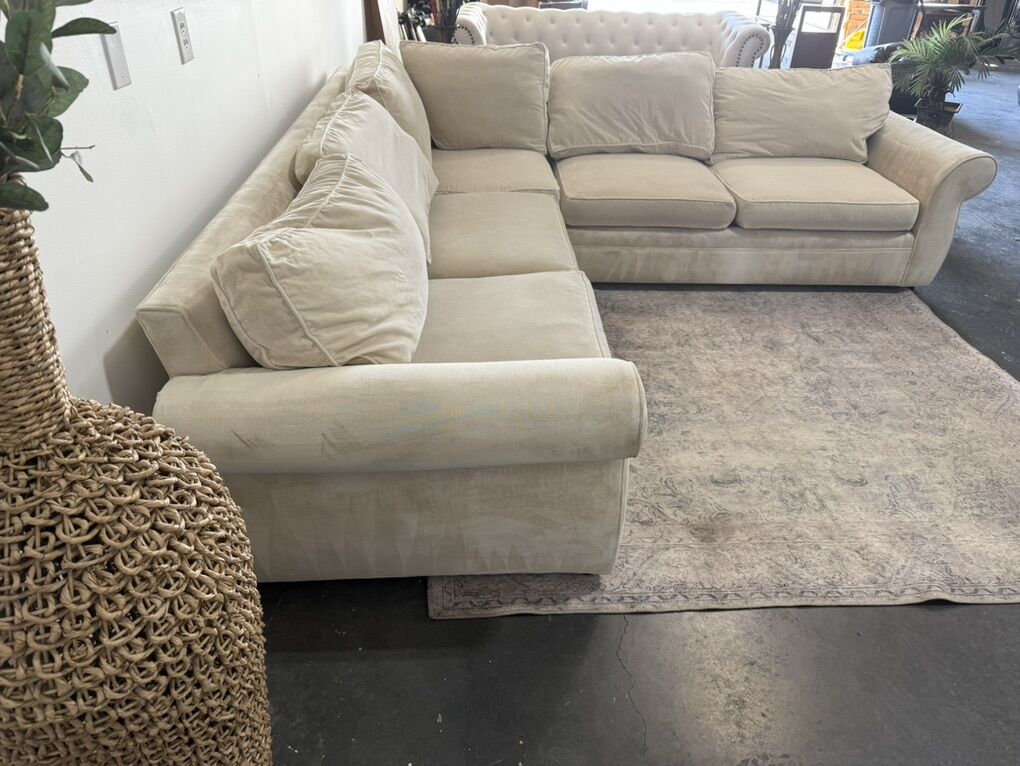 Follow Us On Instagram: SaltLakeSits Retail Price: $6000 Your Price: $799 ‼️Save Over 80% ‼️ ️ Beige Custom Plush Pottery Barn sectional with rolled arms and deep, deep cushions. Two-piece L-shape design with a timeless look and comfortable seating. Upholstered in a soft neutral fabric that works well in any space, with a custom white patterned fabric detail along the back that adds a unique touch. Spacious enough for family lounging or entertaining. 🫧 Expertly Cleaned 🫧 Dimensions: 112” x 112”