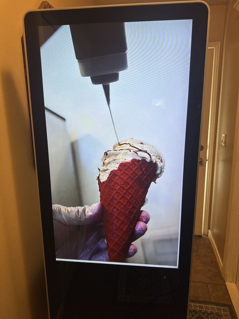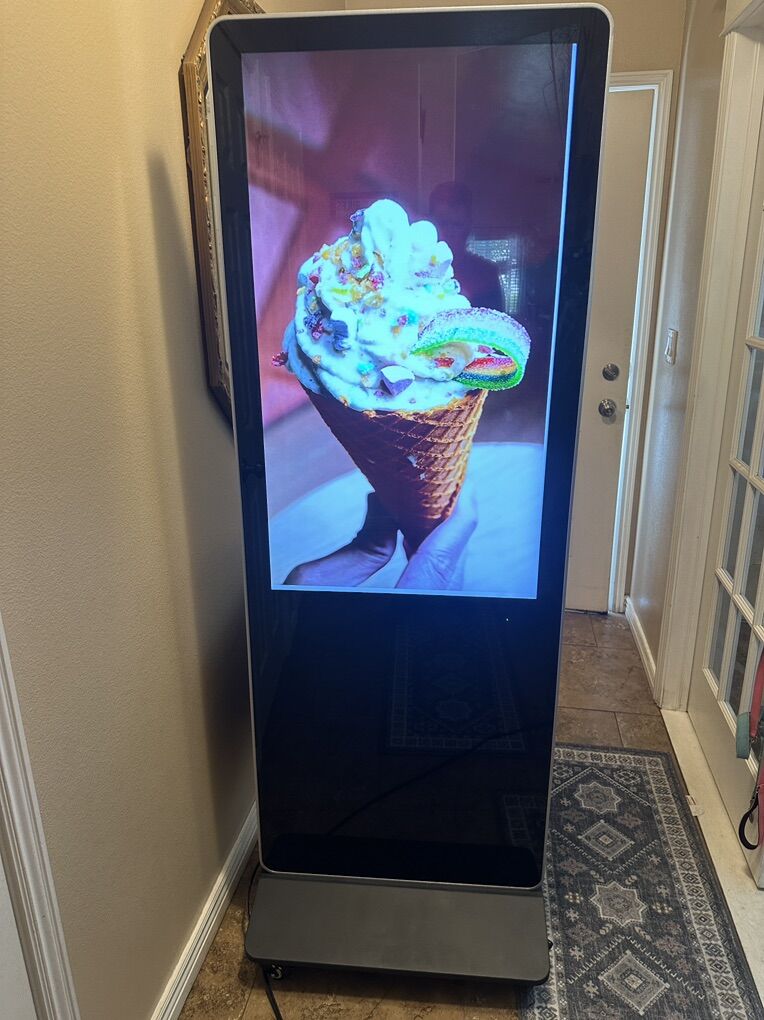 VenmoVertical upright digital signage display. Has a stock video loaded in it which looks amazing. Also has hdmi, usb and other connectors. No remote or key to the back, however a small set of pliers will easily open it up.
