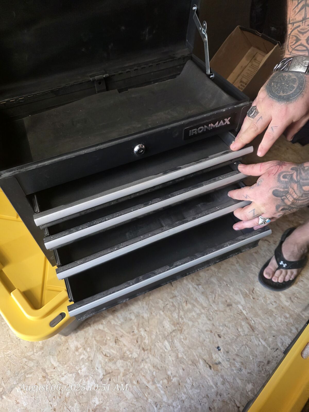black Ironmax tool box. all drawers open. does not have a Key. started out with the basic tools but grew out of it quickly. nothing wrong with it, just dont need it anymore