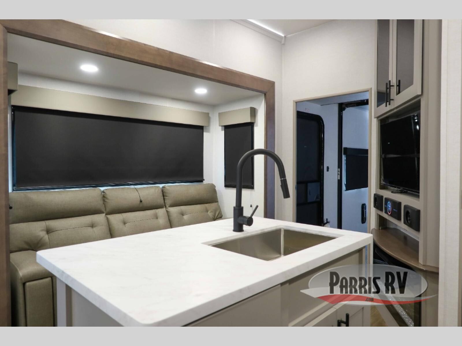 Load up the dirt bikes, pack your bags, and head to the campground in this spacious toy hauler. Once your toys are unloaded using the weather resistant ramp door, relax on the HappiJac roll-over sofas with a folding table in between, and this area can become your guests' bedroom at night since there is a drop-down queen bed, a half bath, plus an additional 30" x 72" bunk/loft bed. You will have the front bedroom all to yourselves that includes a king bed with an optional queen bed plus a wardrobe slide out to keep your space tidy. Everyone can meet in the main living area/kitchen for movie night with the HDTV and sofa slide out, while the chef of makes dinner on the three burner cooktop. There is also a hutch and pantry for storage and a kitchen island for more counter space!