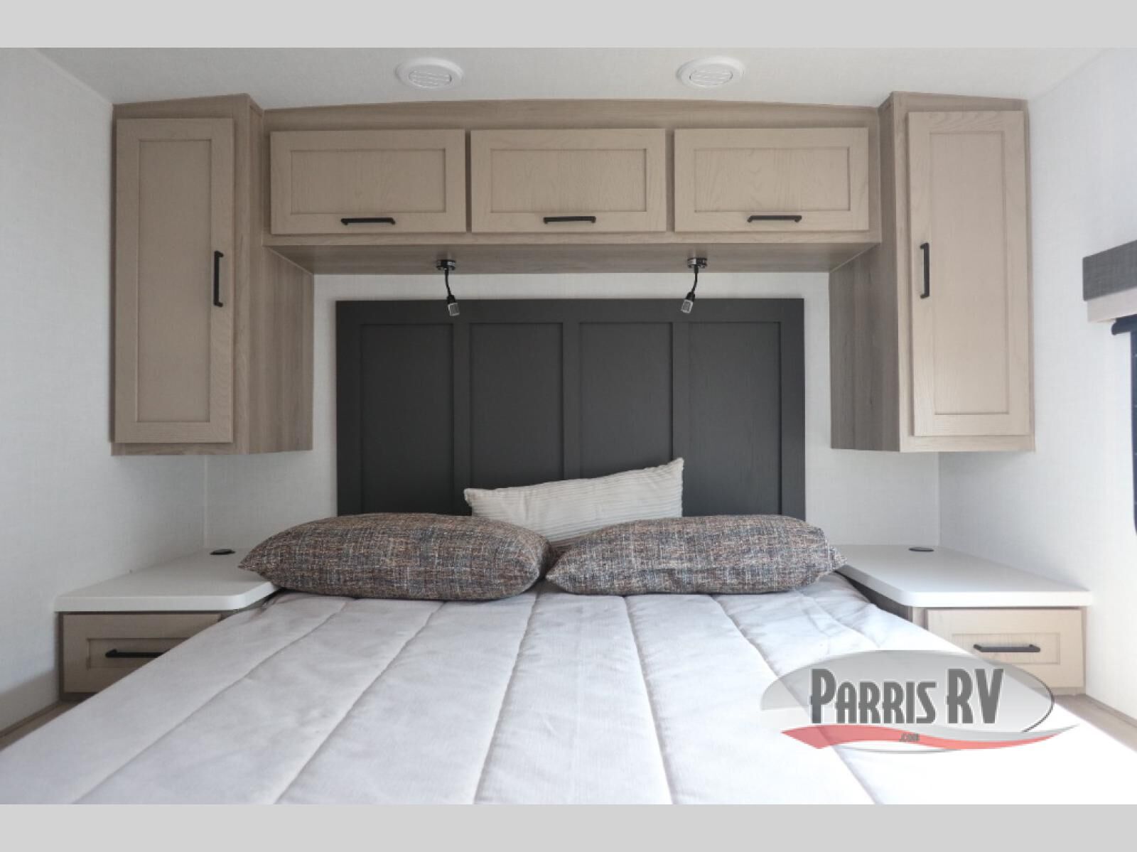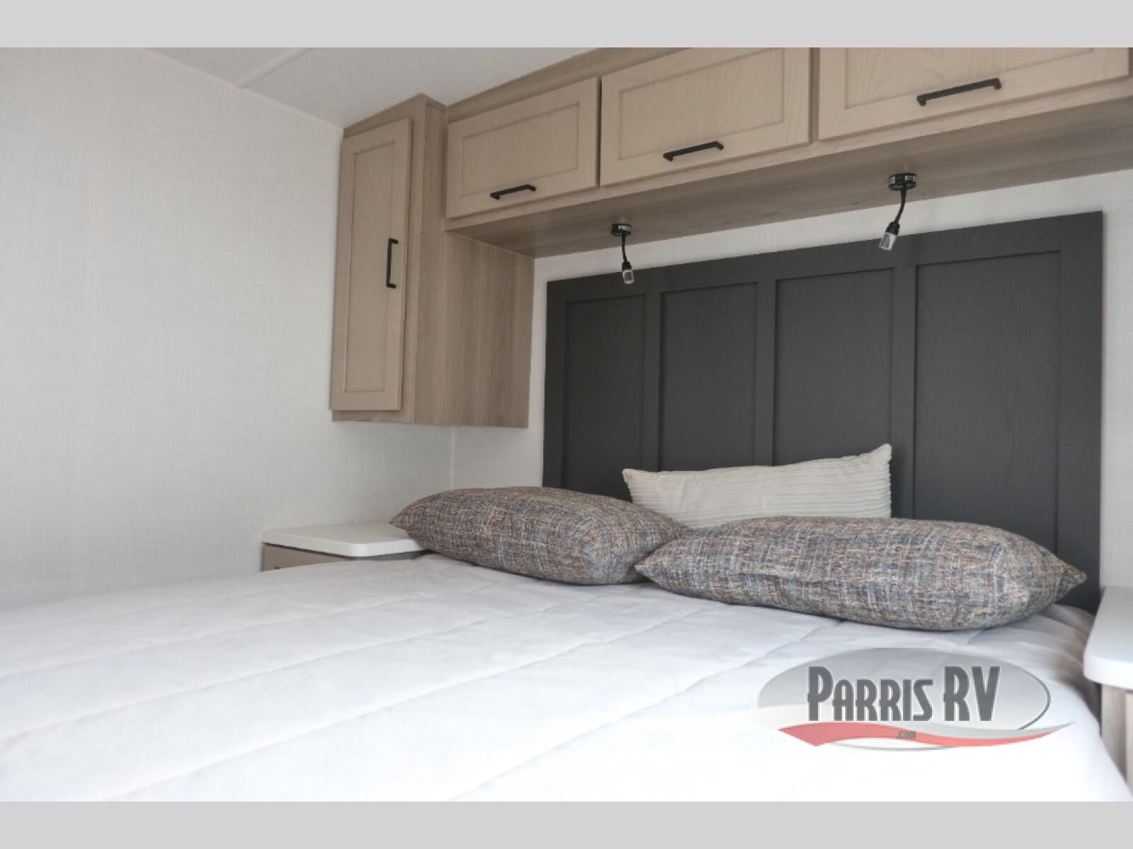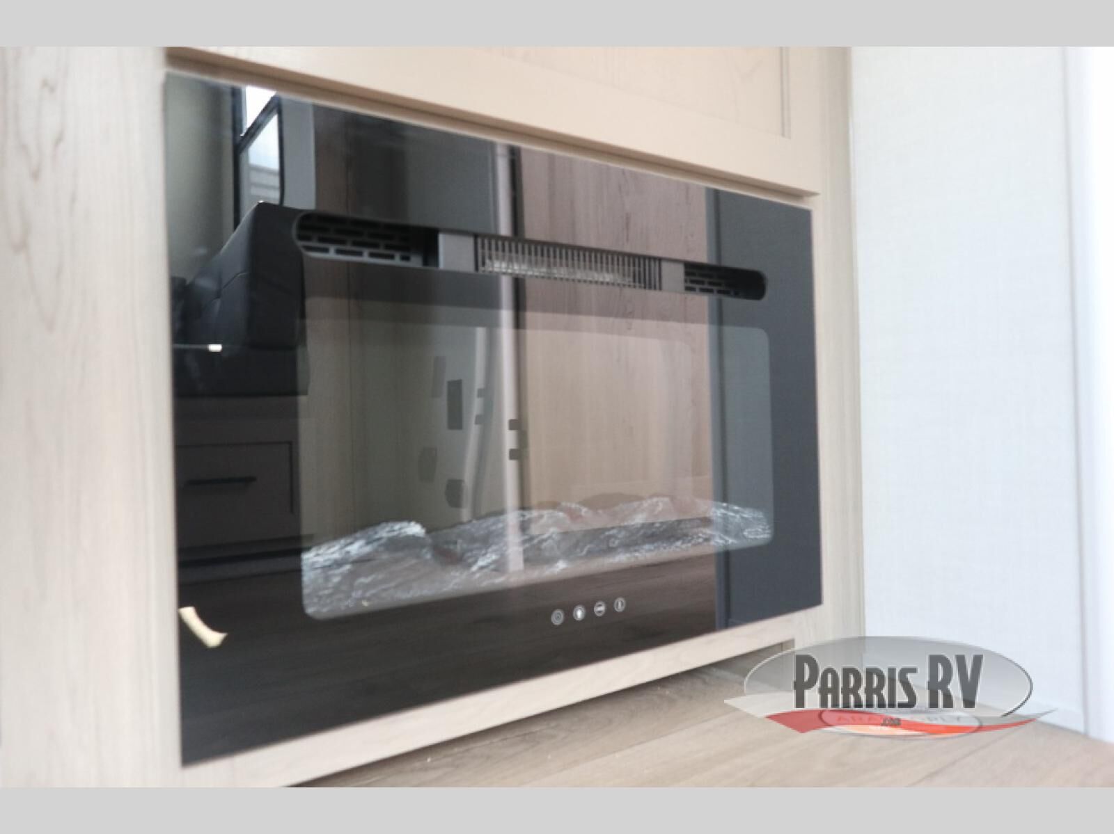 If you like the front kitchen layout, you're going to love this one! You'll have plenty of counter space to prepare and cook meals, or you may just want to head outdoors to cook on the outside griddle. There is a 19' power awning with LED lights to keep you protected from the sun and rain, and there are three exterior storage compartments for lawn chairs, fishing poles, and firewood! This model includes a U-shaped dinette slide in perfect view of the 12V smart entertainment TV and fireplace, and this area can double as your guests' sleeping space at night. You'll stay comfortable in the rear bedroom that includes an RV queen bed, dual bedroom wardrobes, and an optional TV if you enjoy movies in bed!