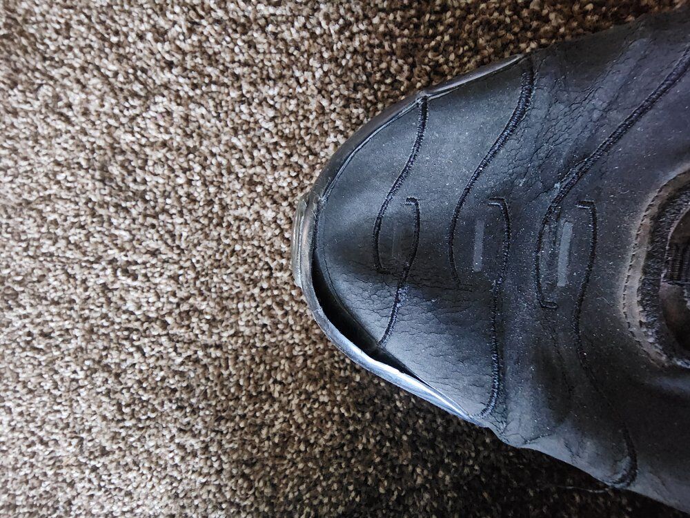 Thinning out my shoe collection, I found these in a box. The toe one the right shoe is slightly peeled away, can easily be fixed. I always take them to a shoe/boot repair shop. They fix these issues for $20. Give them a cleaning too. They need TLC and will last you a long time!