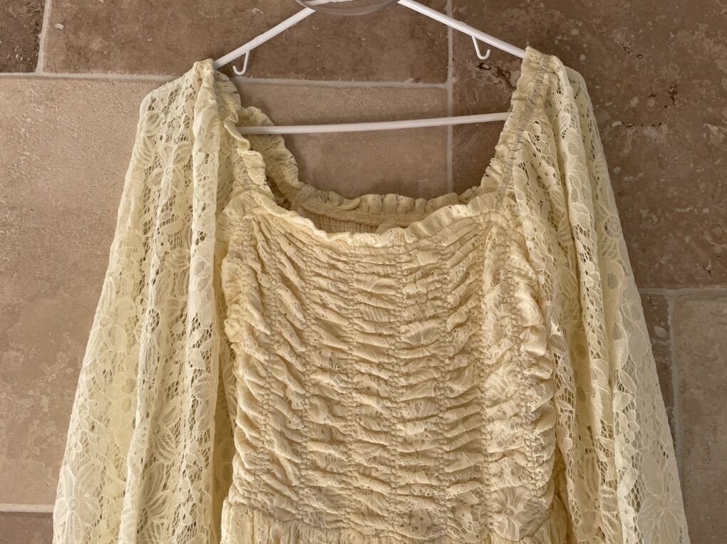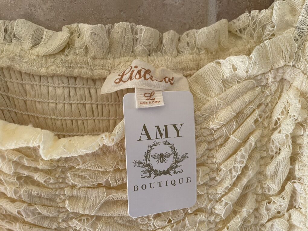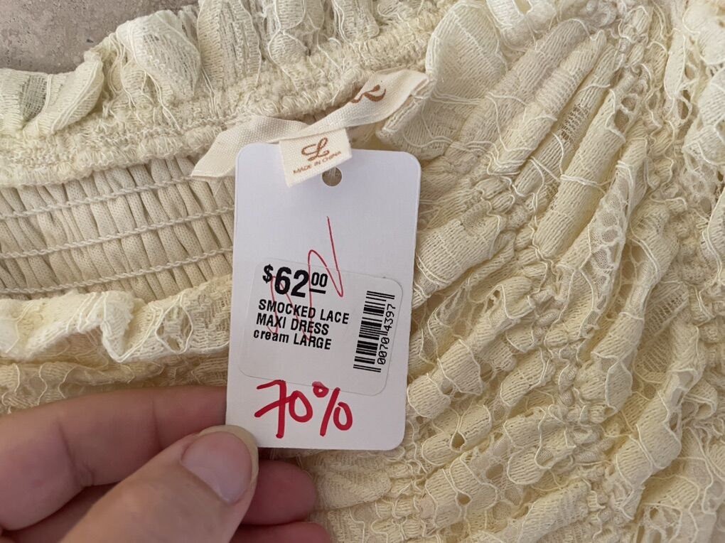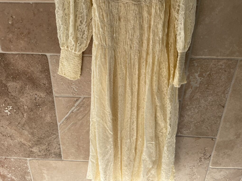 I have a new smocked lace maxi dress. It was made by Listicle and sold at Amy Boutique. It is a size Large. It’s a cream color. The price tag shows it was originally $62. See my other ads for jewelry, artwork, home decor and more.