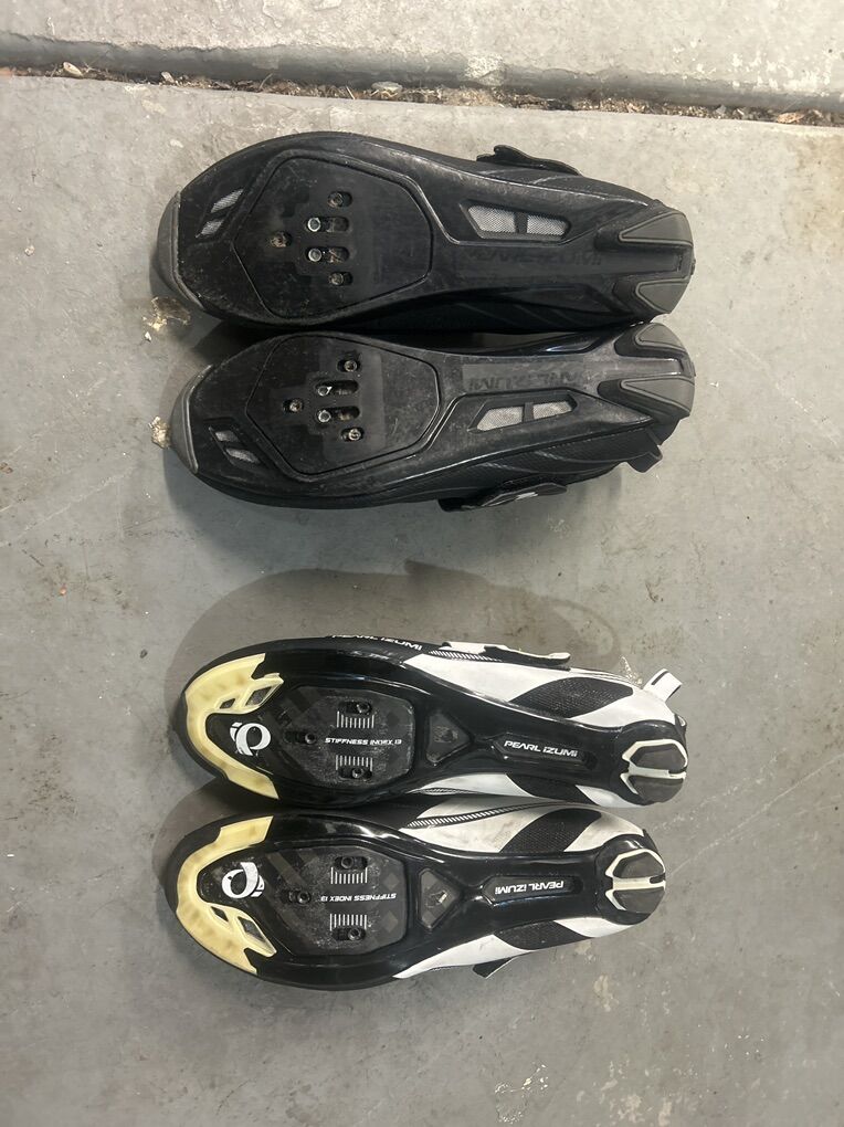 VenmoTwo different pairs of Pearl Izumi cycling shoes, both very lightly used and in like new condition. The white/black pair is a 42.5 and has carbon soles (so a touch lighter), while the all black pair is a 43 and has all plastic soles. I got the white and black pair originally as I am usually a true-to-size men’s 9 or 9.5. The 42.5s were a touch too tight for my comfort. So I went up a half size with the all black ones…and they fit exactly the same. Pedals or cleats not included, although I could include some old SPD-SL cleats for free (no pedals), some SPD pedals+cleats for an extra $20, or some Look KEO Classic pedals+cleats for an extra $40.