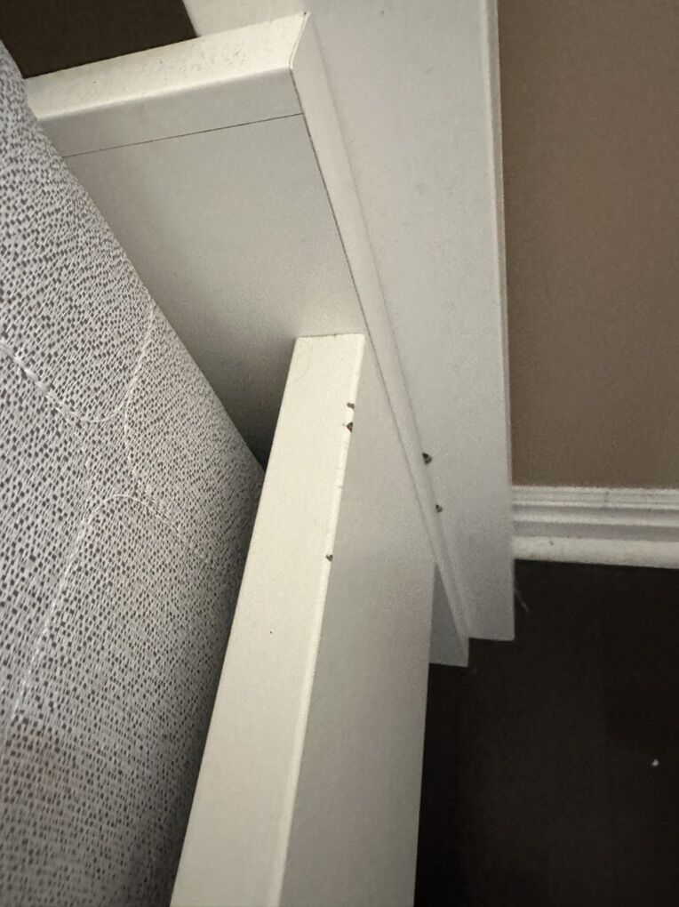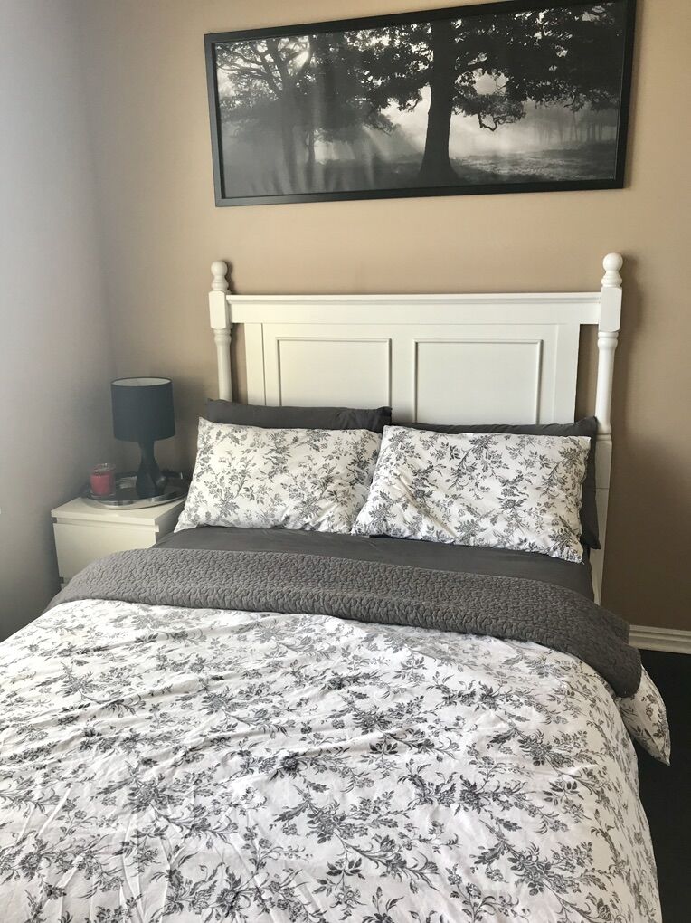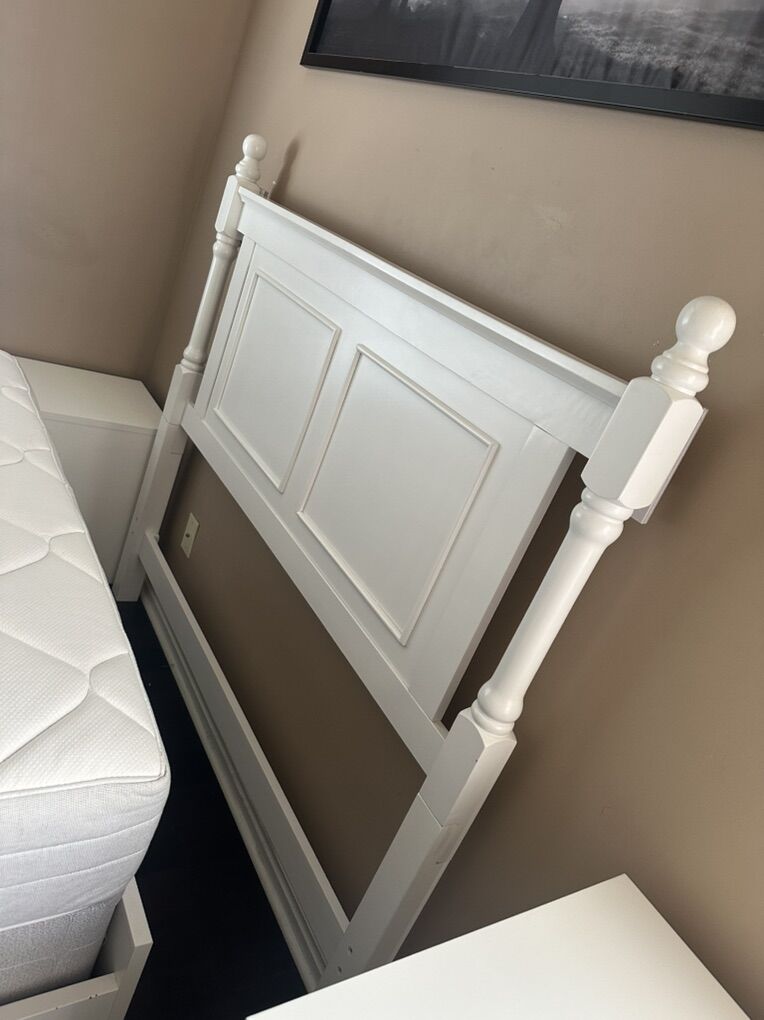white double/full size bed frame plus bed base. I’m selling the headboard separately as it’s not attached to the bed. Please go and check other furniture I’m selling from the guest room which has low traffic.
