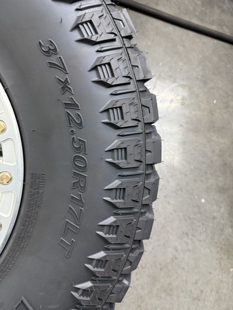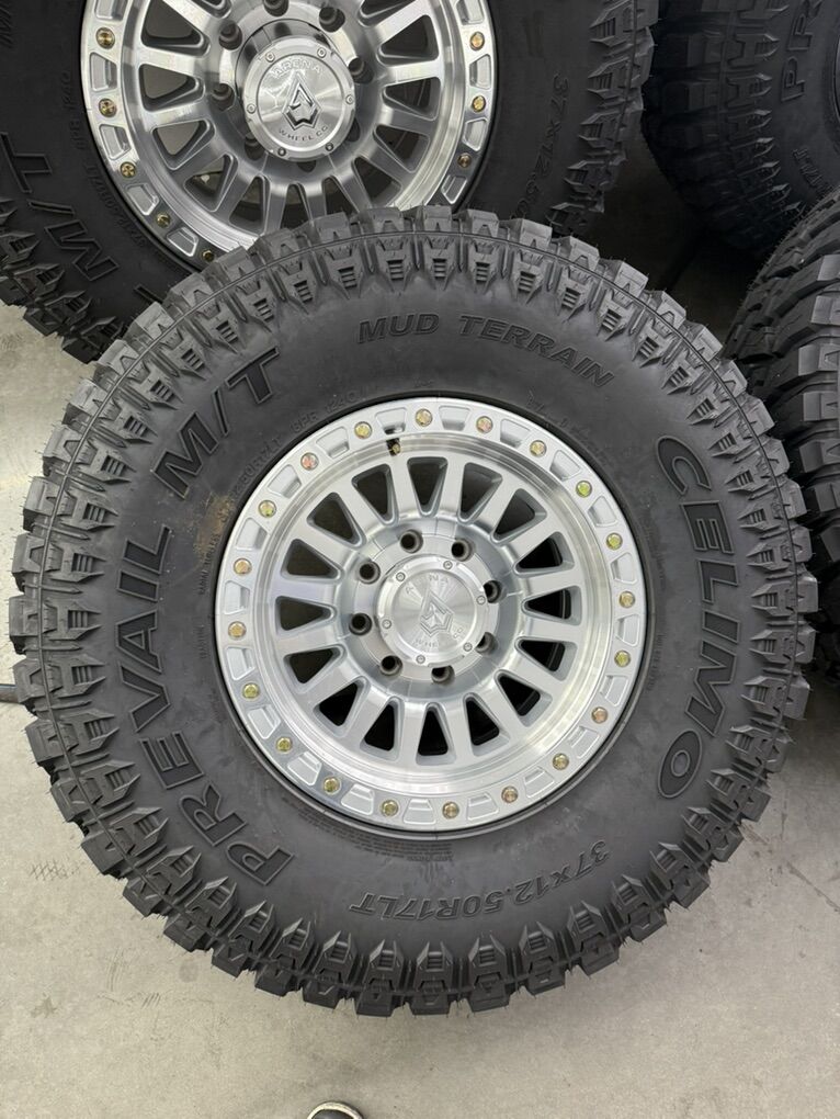 Wheels are 17x9 arena Offroad wheels, 0 offset, machined finish, one of the most desired Offroad wheels on the market right now. All the center caps are also included, everything is in like new shape, wheels look as if they just came out of the box. Tires are 37x12.50r17 prevail m/t, 124Q, very nice and quiet riding tires, no patches or plugs, less then 800 miles so they are basically brand new.