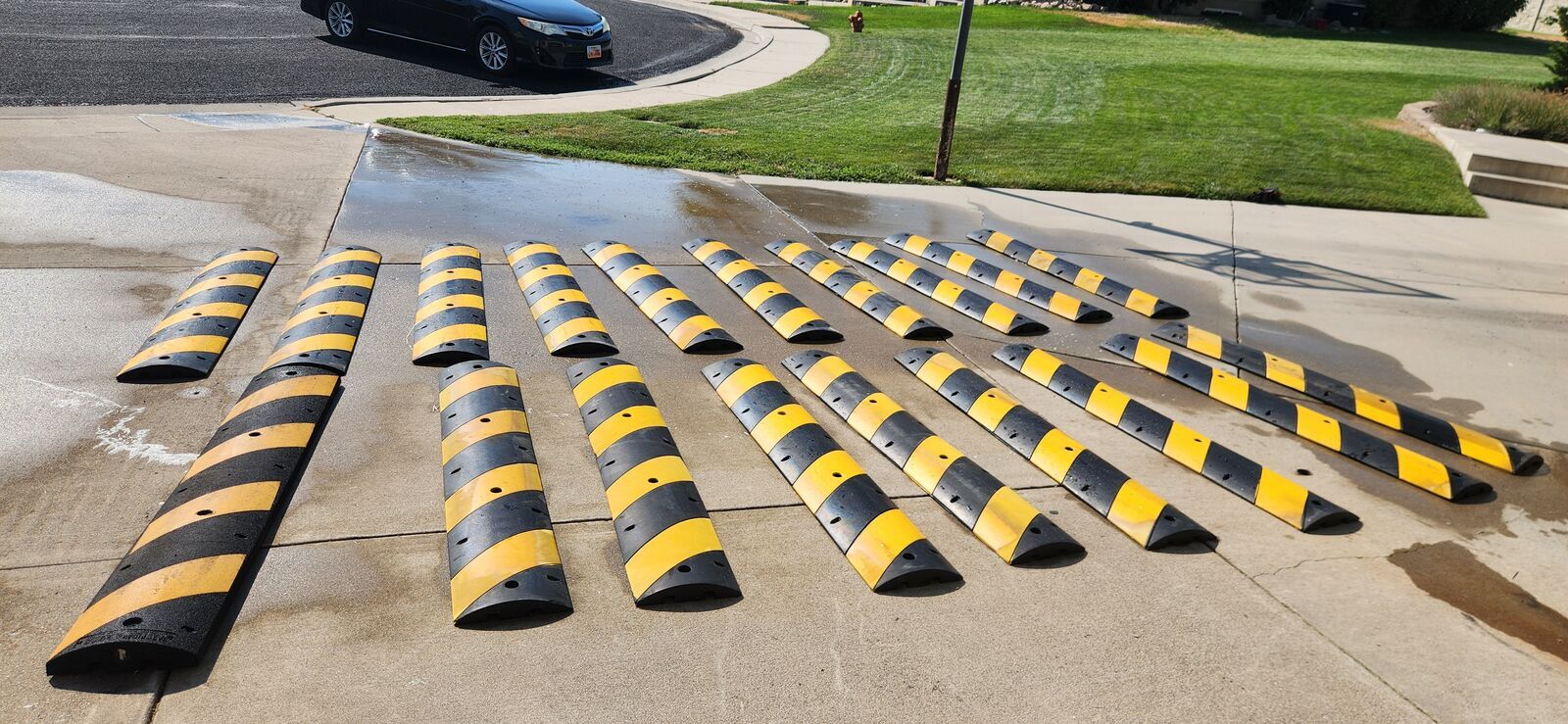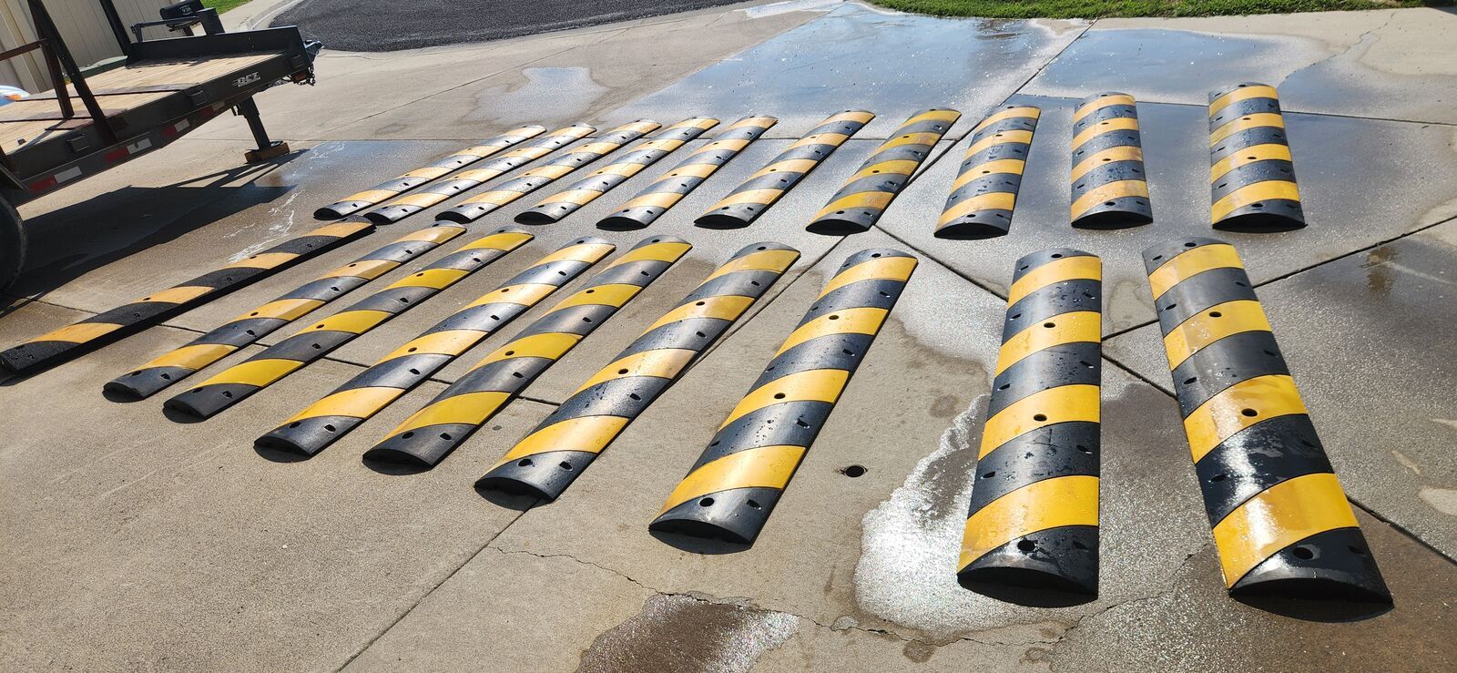 VenmoSome color fading on the yellow, but does that really matter for something that's going to get driven over every day? LOL I've got (18) with the below specs and (1) odd ball that doesn't taper all of the way back to the pavement but is very similar in size (last picture). $30 each or all 19 for $500. Delivery available for an added fee. Cable Channel Height1 in Cable Channel Width1-3/8 in ColorBlack/Yellow Height2-1/2 in Includes Cable ChannelYes Includes Installation HardwareNo Installation MethodBolts; Spikes Installation SurfaceAsphalt; Concrete Length6 ft Weight58 Lbs MaterialRubber Number of Cable Channels1 Number of Installation Holes4 Product TypeSpeed Bump Tensile Strength725 psi Traffic Speed Rating1 to 5 mph Width12 in Manufacturer Part Number29NH35 UNSPSC46161509