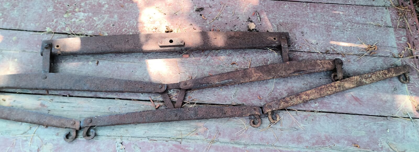 ZelleThis is an old time Triple-Tree Wagon Hitch for three horse teams. It has been hanging on our fence for just about 25 years and the fence finally fell down. The new fence will not hold it (60 pounds) so it needs a new home. This is not your decaying wood triple-tree, this is all steel and will last several life times as it has already. I would say this is from the 1940's or maybe 30's or maybe 20's, who can tell? Pick it up here in Heyburn, I will take it to UPS for anyone who wants to arrange with UPS to ship it at their expense. UPS would probably have a hernia. Call if you have questions.