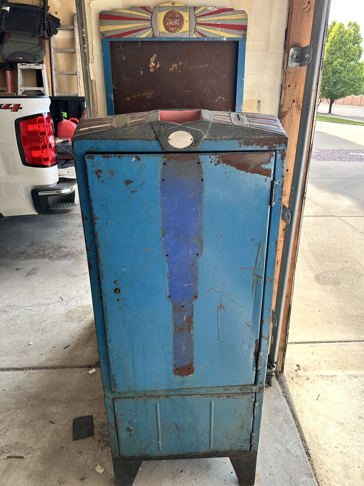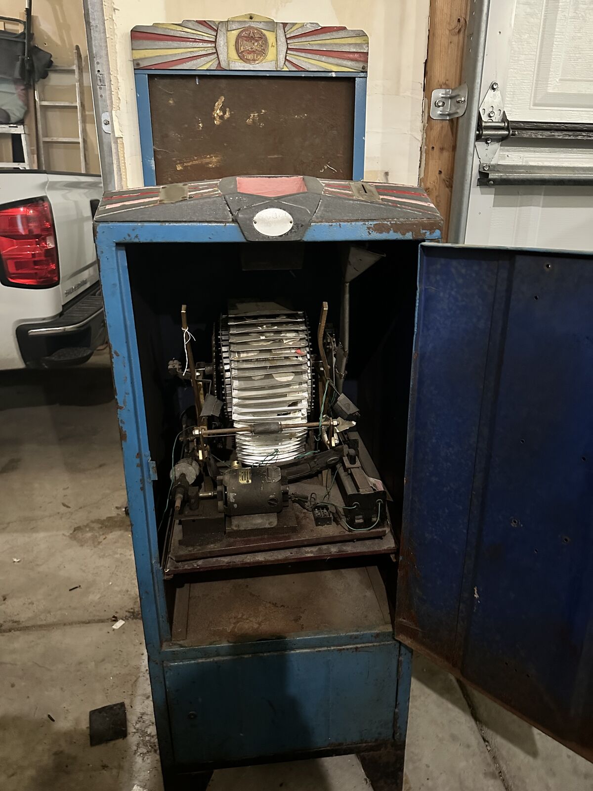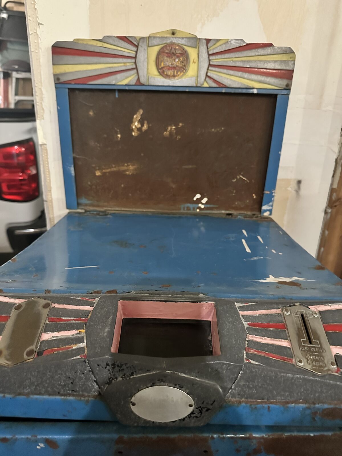 Peerless Pictures stereoscopic viewer, c.1950's original Penny Arcade 'What the Butler Saw' machine, Klaxon motor driven mechanism, takes 1d coins, will fit 48 images of scantily clad ladies, contained in a blue painted steel case with decorative back plate, in need of restoration