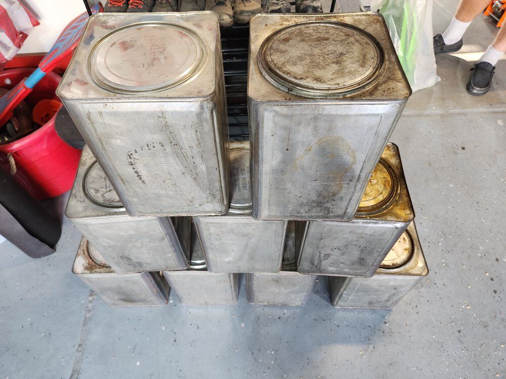 Vintage large 5 gallon silver tin metal pry-top lightweight container. Large round friction top lid.