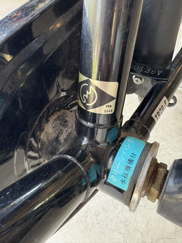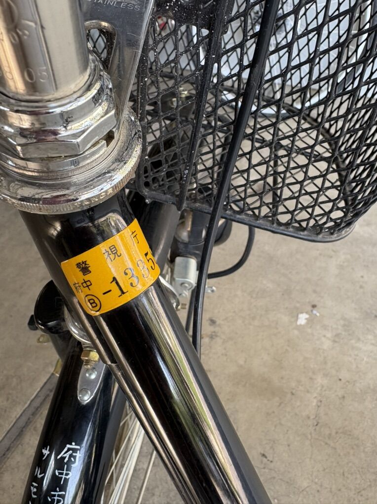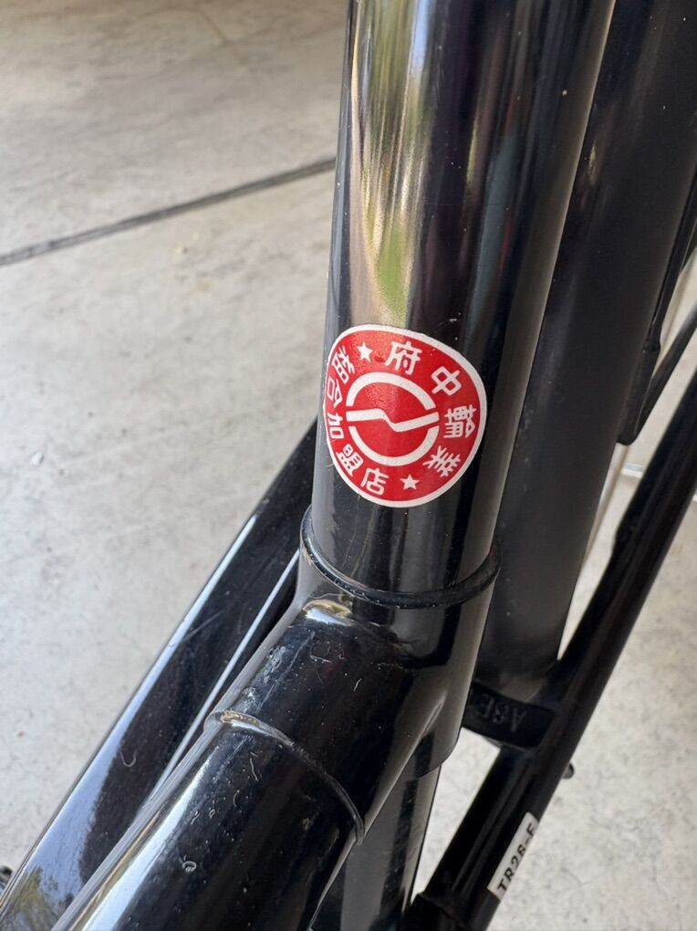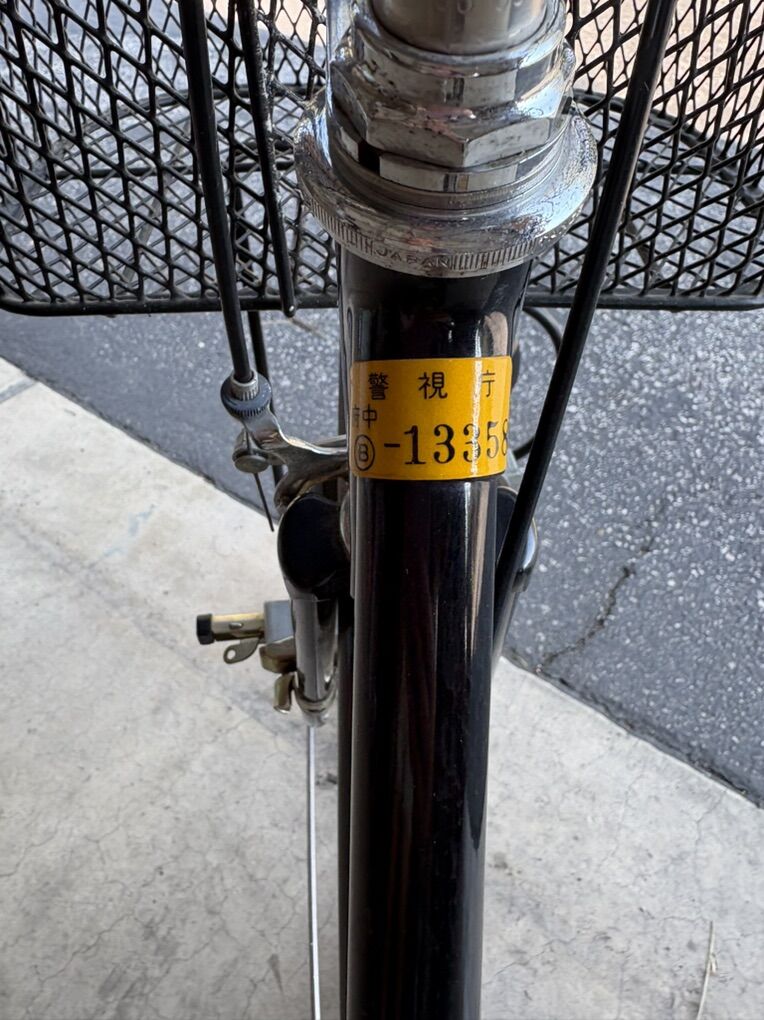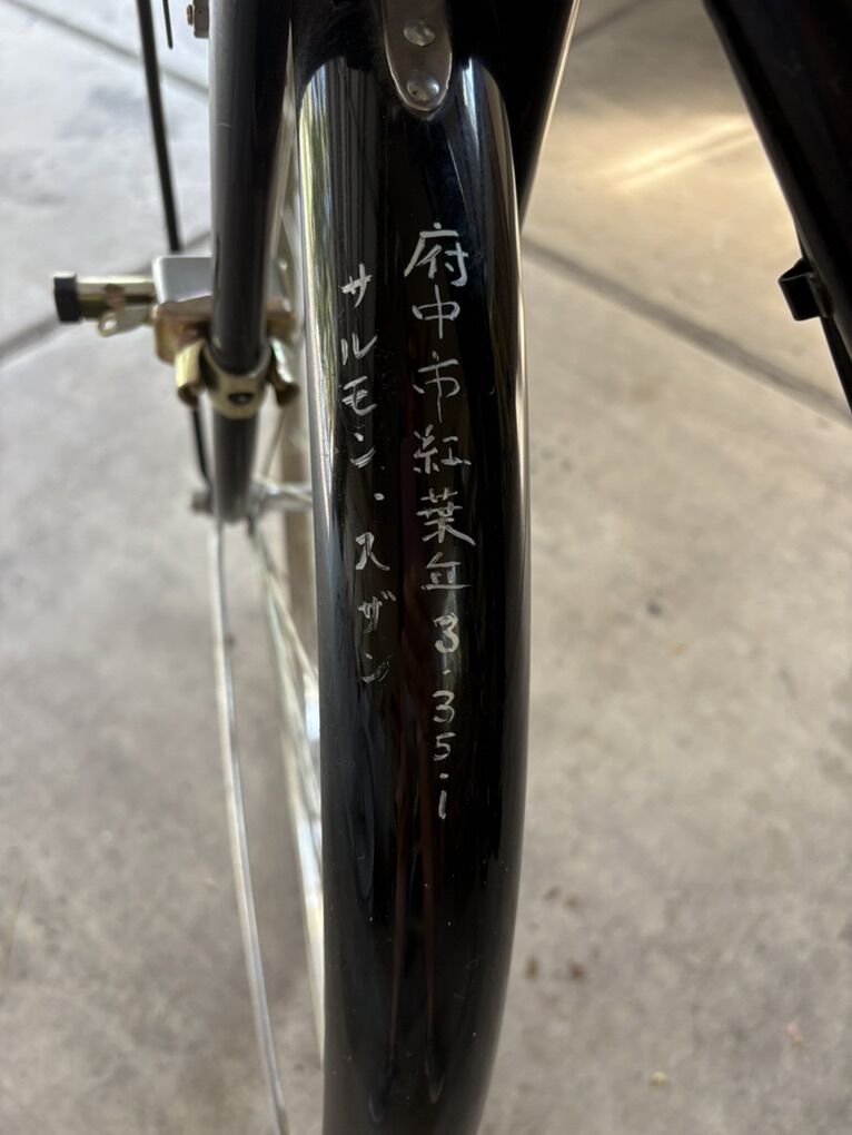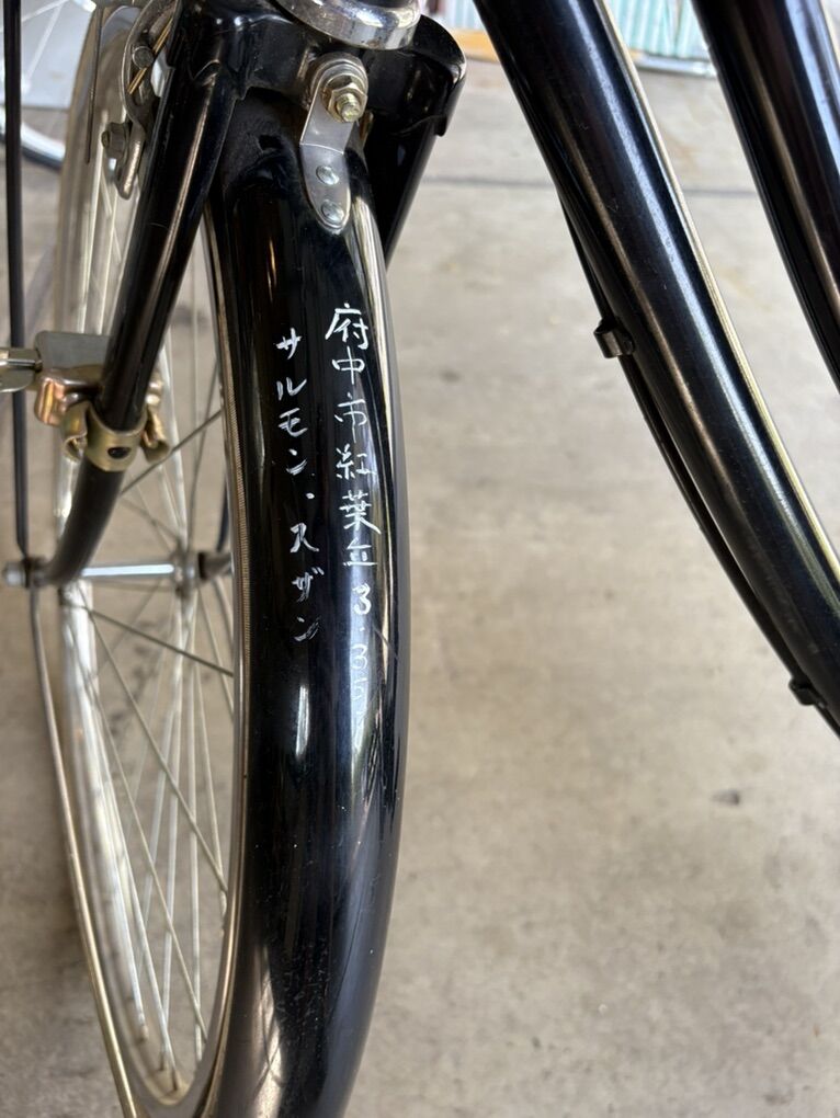 There is what appears to be a hand written location and possibly a license number on the bike. When I use the google translator it says the bike is from Momijigaoka (紅葉丘) - a populated place, specifically a town or district, located in Fuchū City, Tokyo Prefecture, Japan.