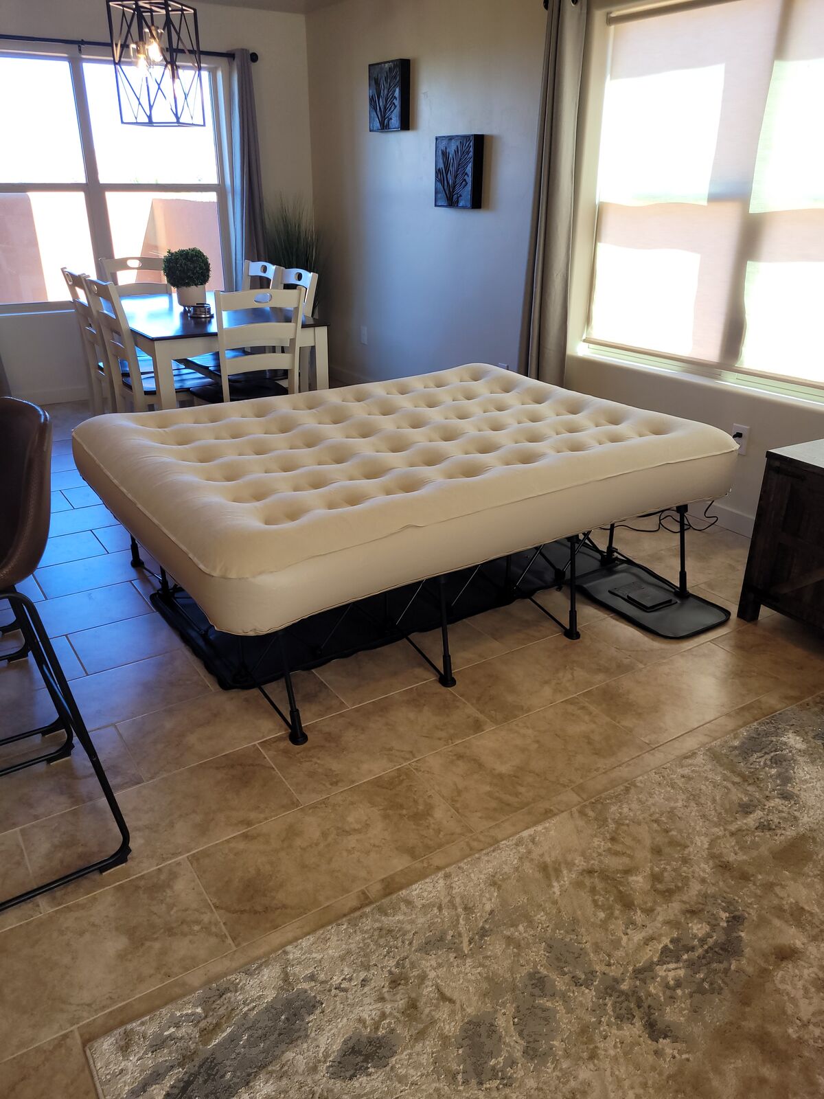 The main level features spacious seating and a dinner table for 6. There is a rollout queen size bed that self inflates and self deflates, simply plug it in (So much more comfortable then a sleeper couch). This rollout bed is very easy to move and set up and requires no lifting. There are two outside patios with a BBQ and plenty of space for locking up bikes and personal gear on the front patio. The rear patio gives way to outstanding views of a grass field.