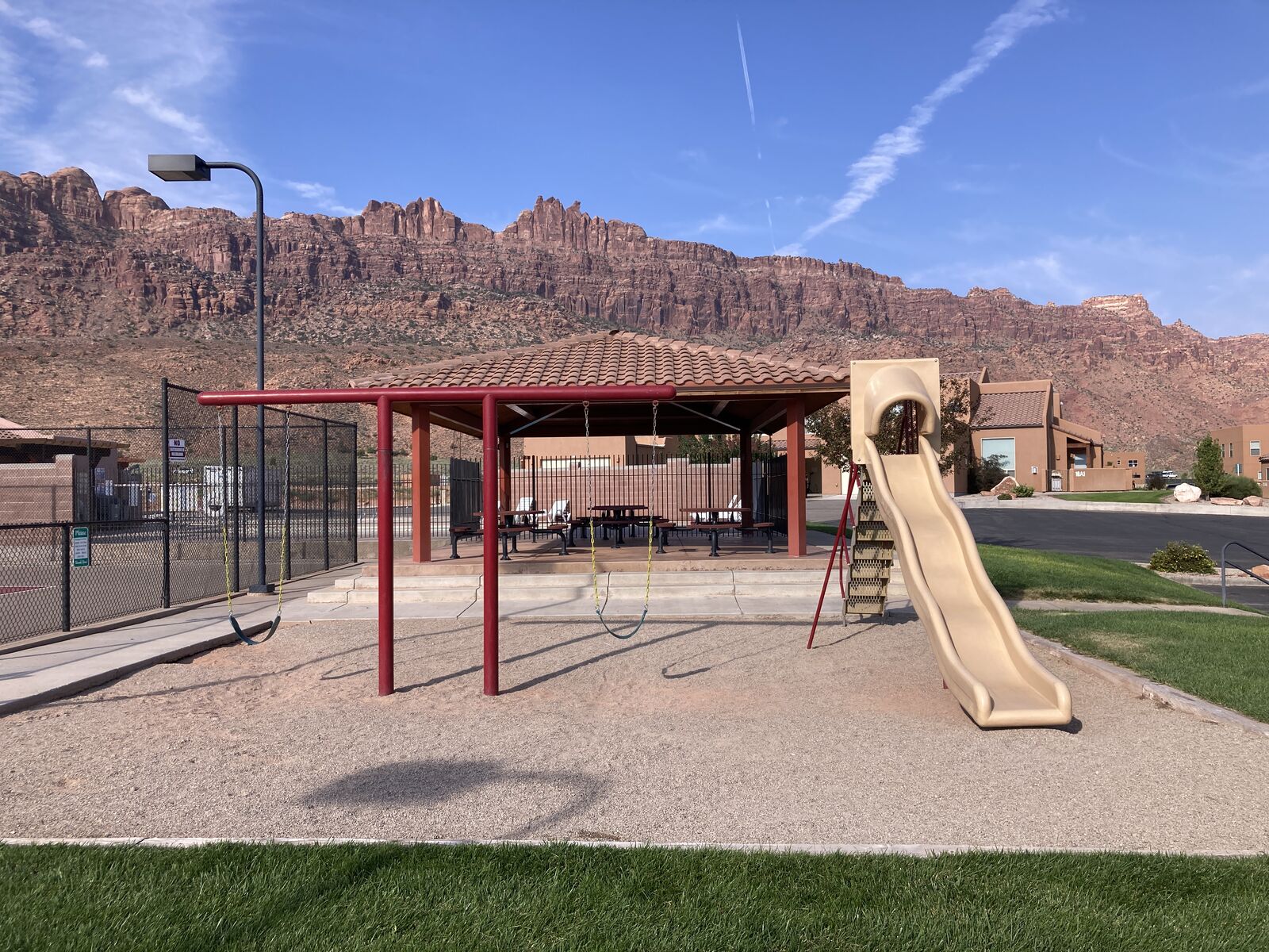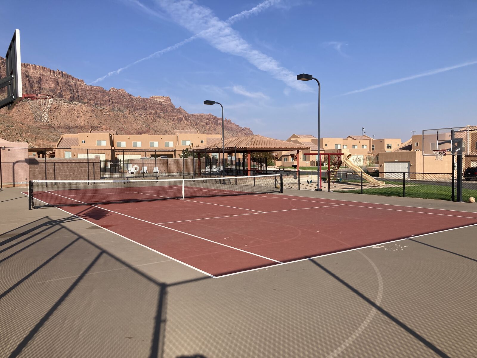 There are two pools and a hot tub, tennis court, basket ball court, play ground and slide and pavilion with tables.