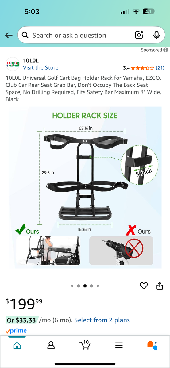 Venmo1OLOL Universal Golf Cart Bag Holder Rack for Yamaha, EZGO, Club Car Rear Seat Grab Bar, Don't Occupy The Back Seat Space, No Drilling Required, Fits Safety Bar Maximum 8 Wide, Black — New Will accept returns within 2 days if not working or missing critical part, unless specified previously. In North Ogden, pickup only. FCFS, hold with Venmo.